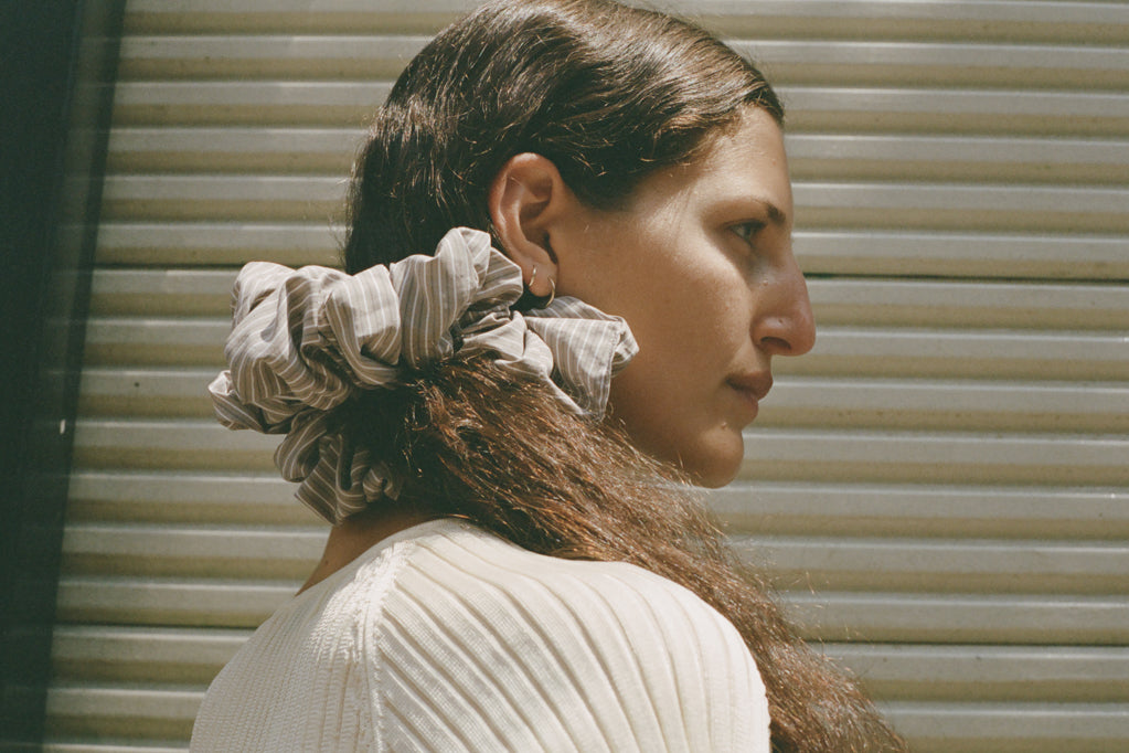 A gathered cotton scrunchie. To be worn in the hair or adorned on the wrist.