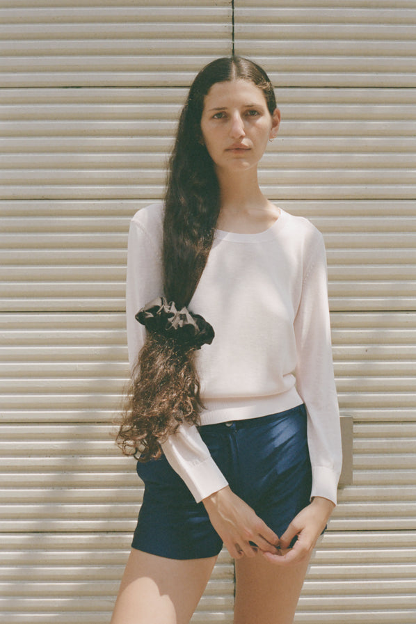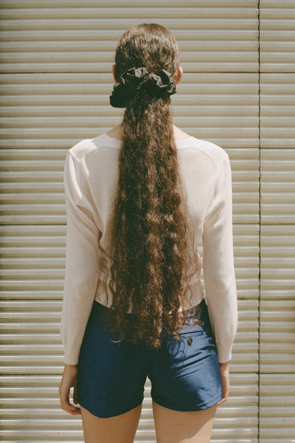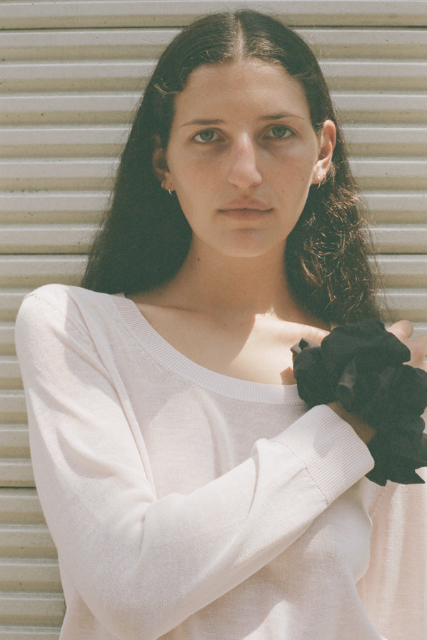 A gathered cotton scrunchie. To be worn in the hair or adorned on the wrist.