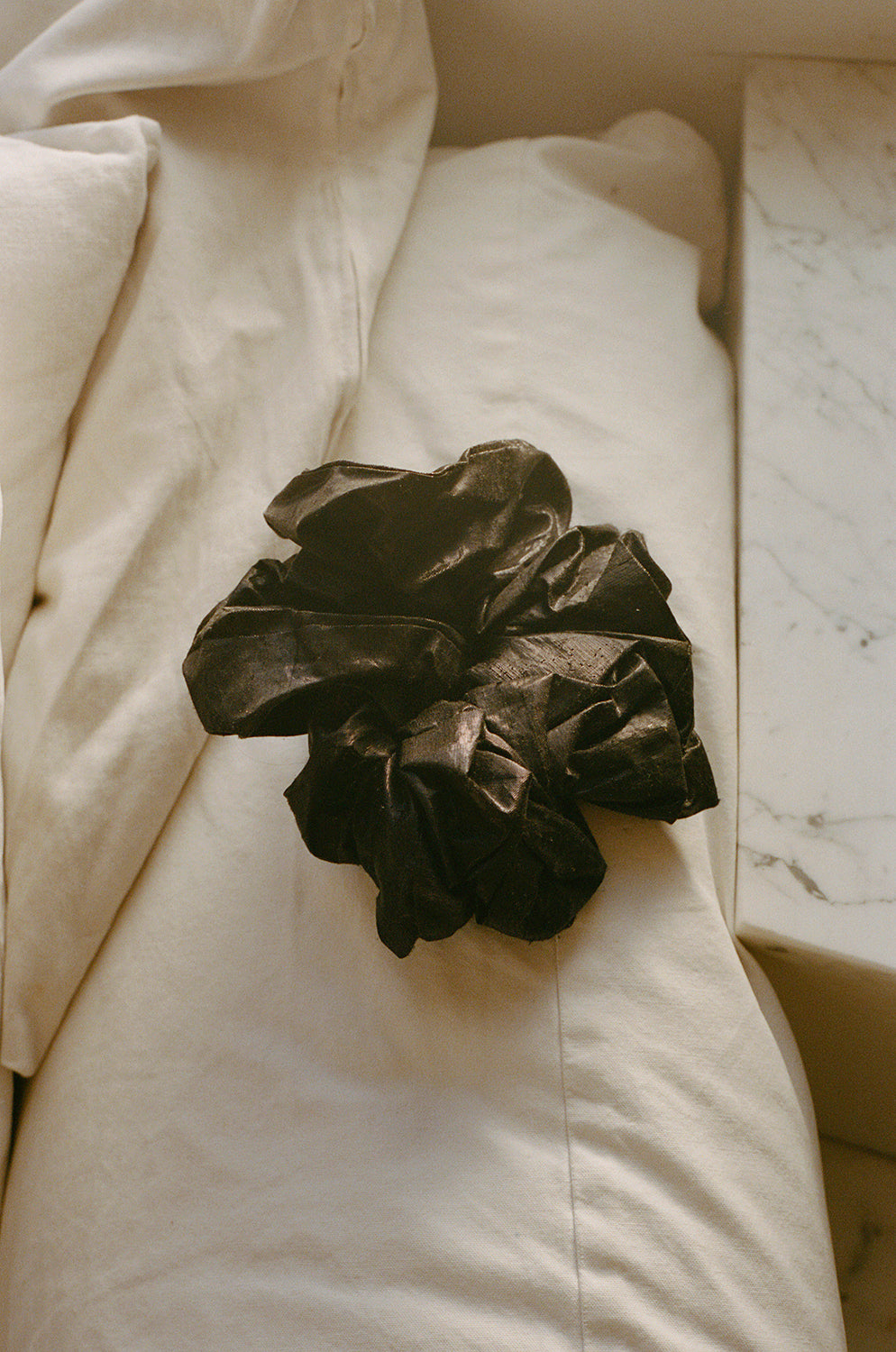 A gathered scrunchie. To be worn in the hair or adorned on the wrist.