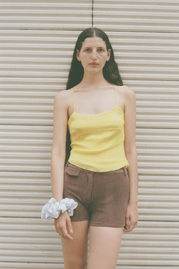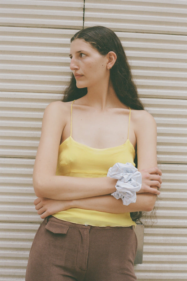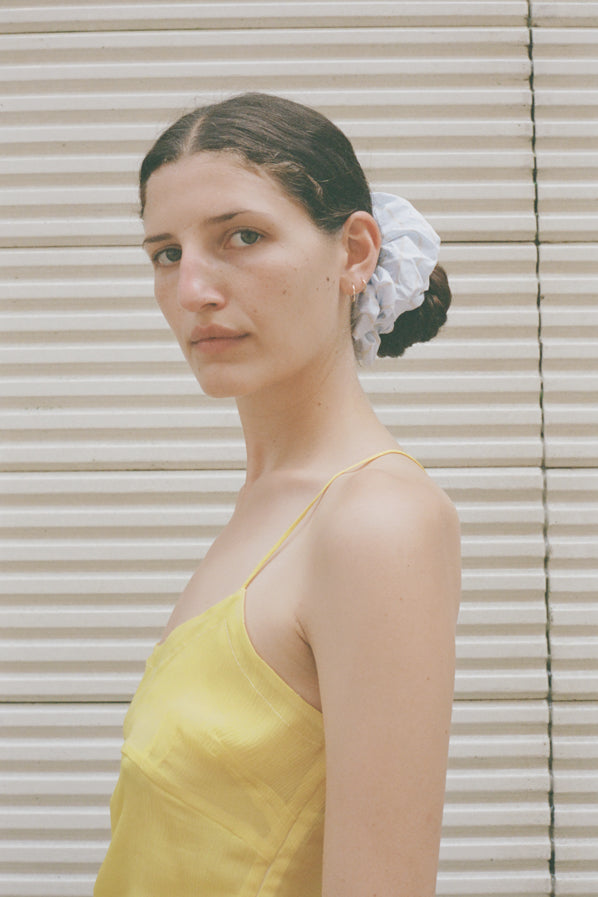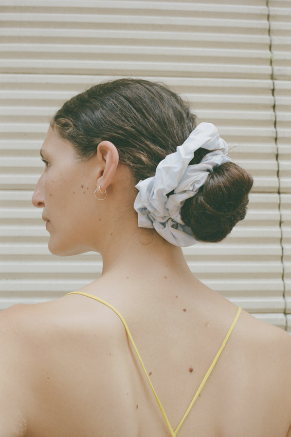 A gathered cotton scrunchie. To be worn in the hair or adorned on the wrist.