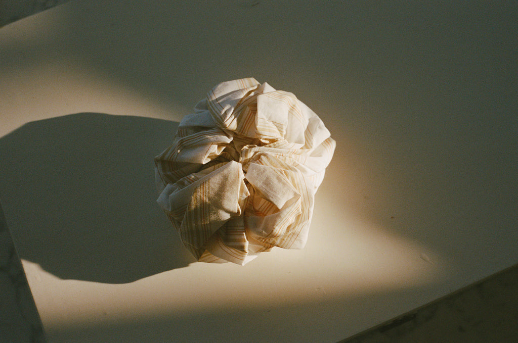 A gathered cotton scrunchie. To be worn in the hair or adorned on the wrist.