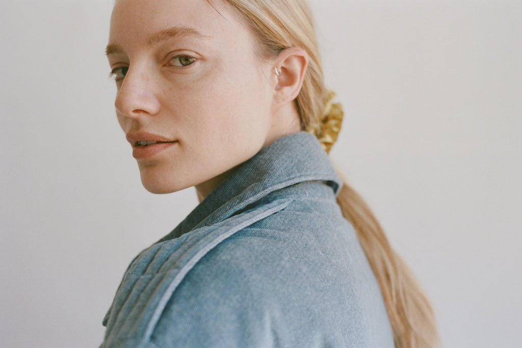 A furled silk scrunchie resembling carnation petals. To be worn in the hair or adorned on the wrist.