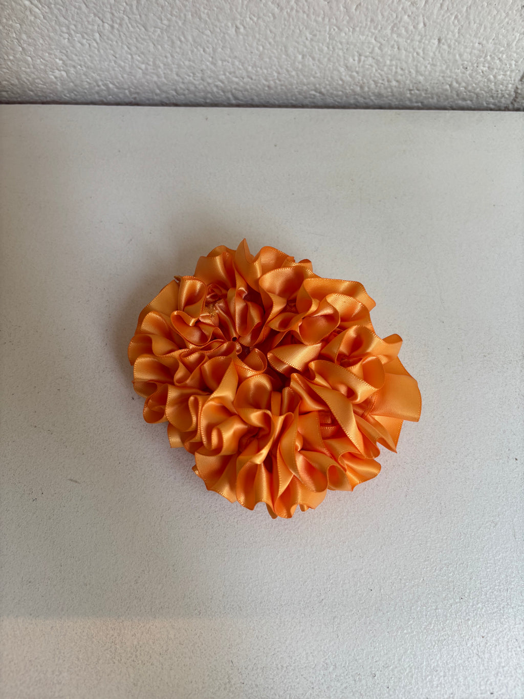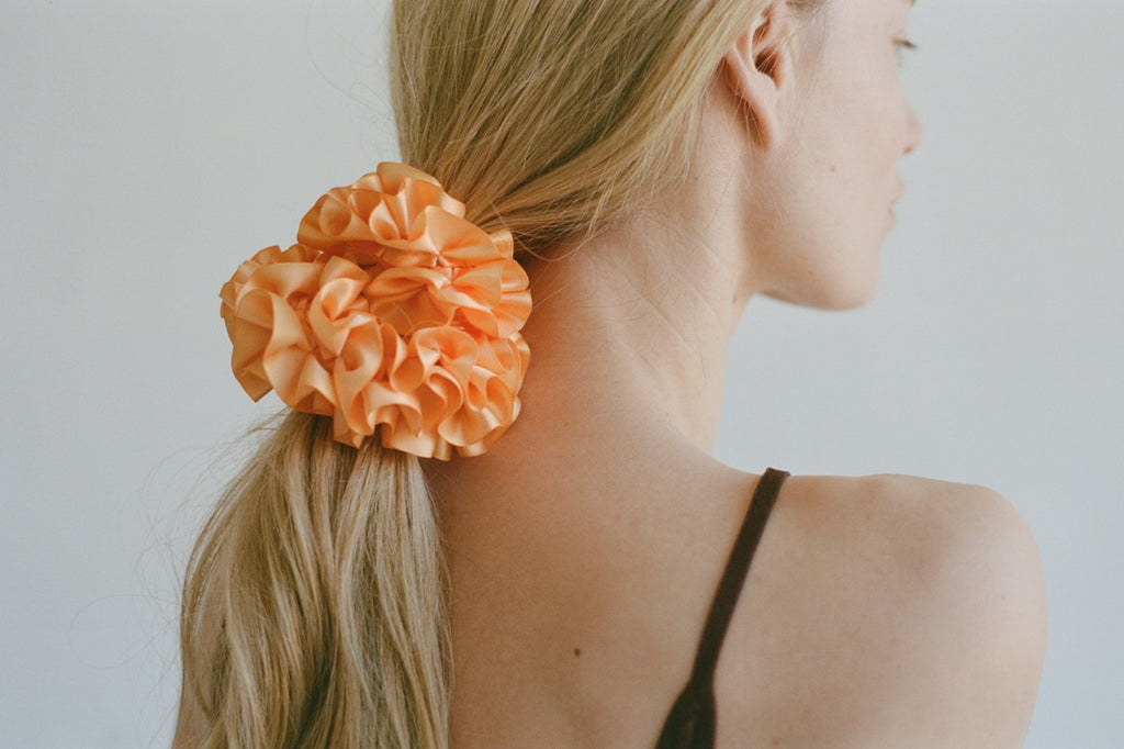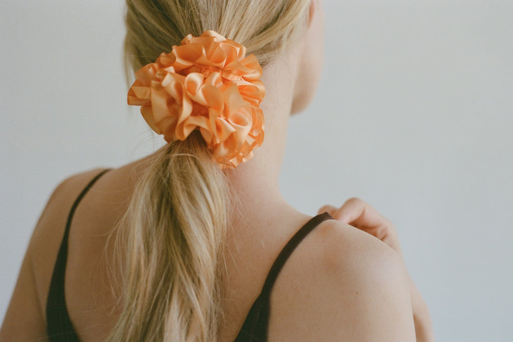 A furled silk scrunchie resembling carnation petals. To be worn in the hair or adorned on the wrist.