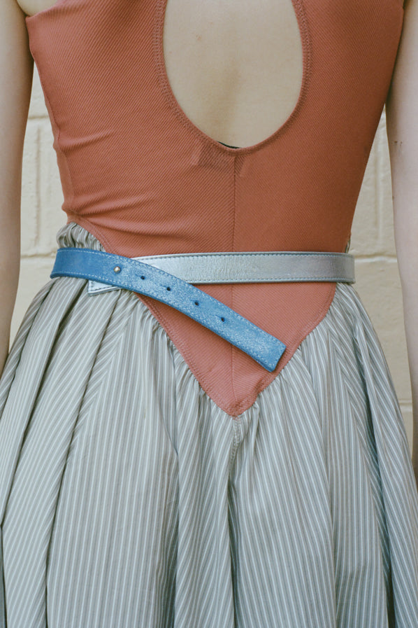 A belt with two straps linked together, in slightly different shades. With stud closure.