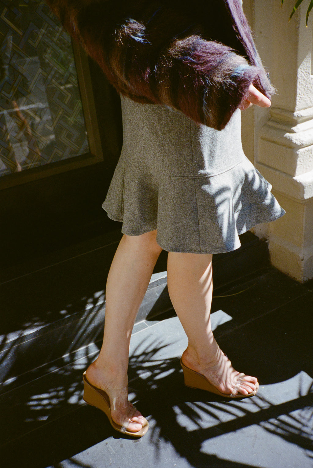 Knee length skirt with flounce detail at the bottom, zip closure at back.