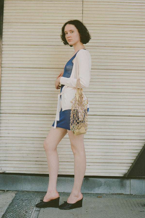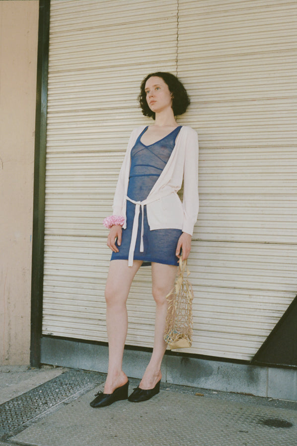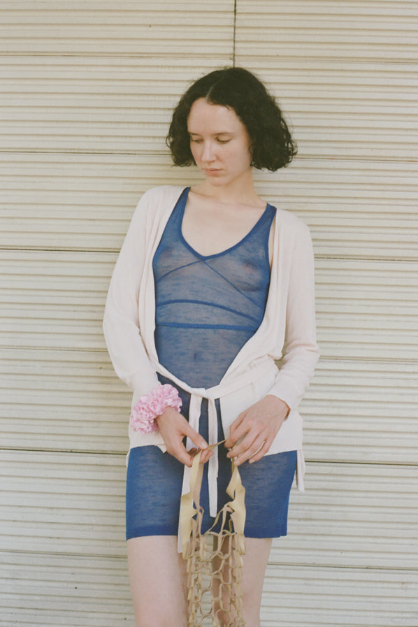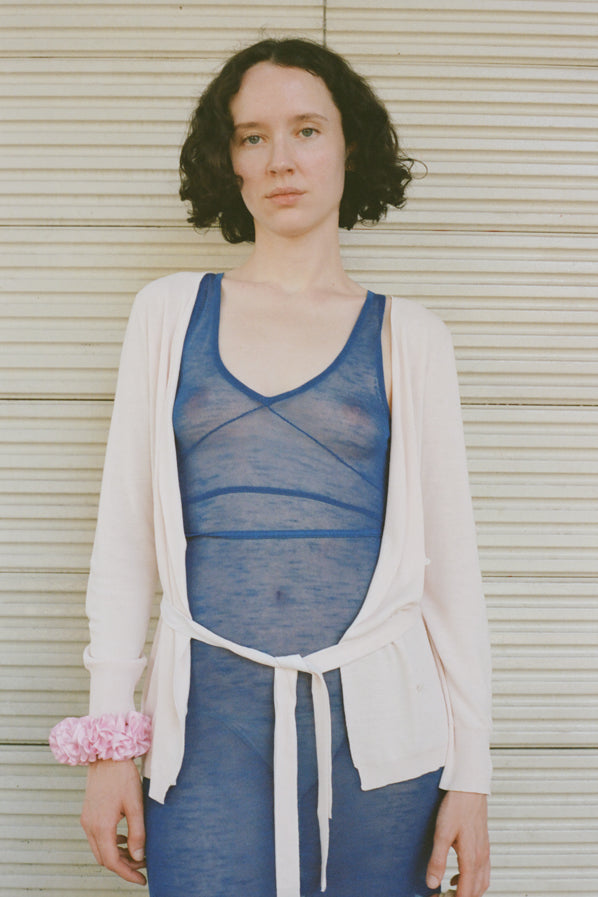A lightweight summer cardigan featuring a V neckline, a waist tie, and mother of pearl buttons.