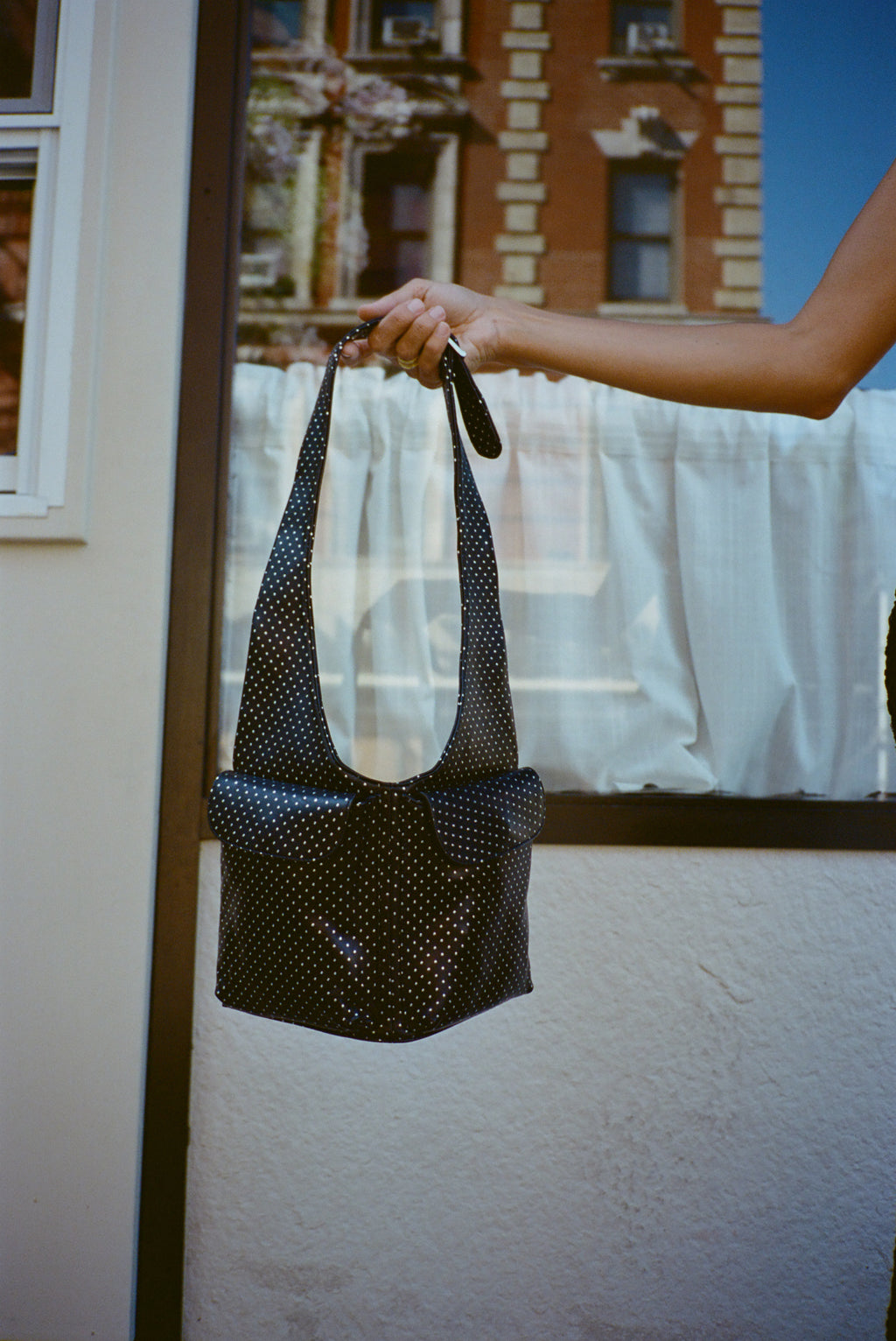 A flat shoulder bag featuring two flap patch pockets with snap fastenings. Zipper compartments at opposite side. Adjustable buckled shoulder strap. Silver-toned hardware.