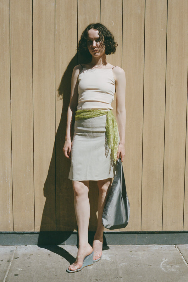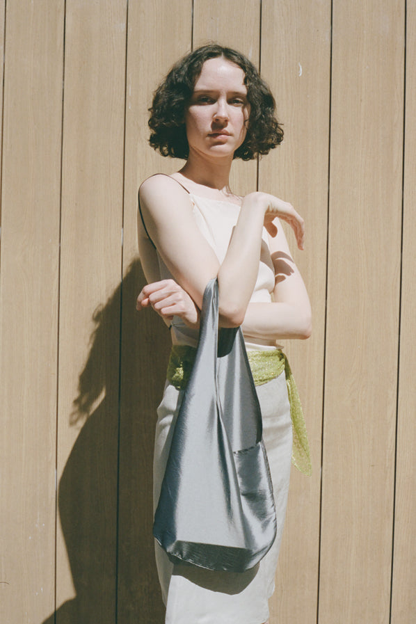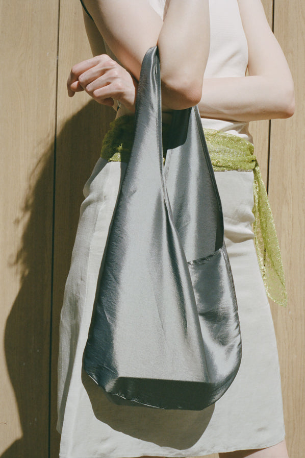 A shoulder tote bag with ovular construction and a wide flat strap.