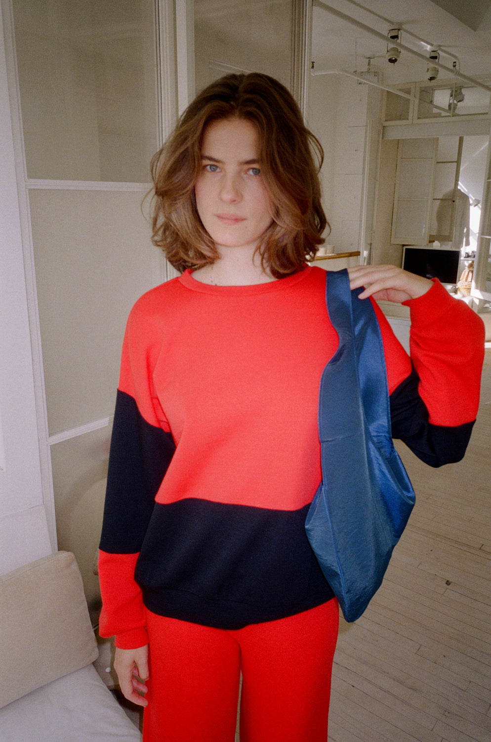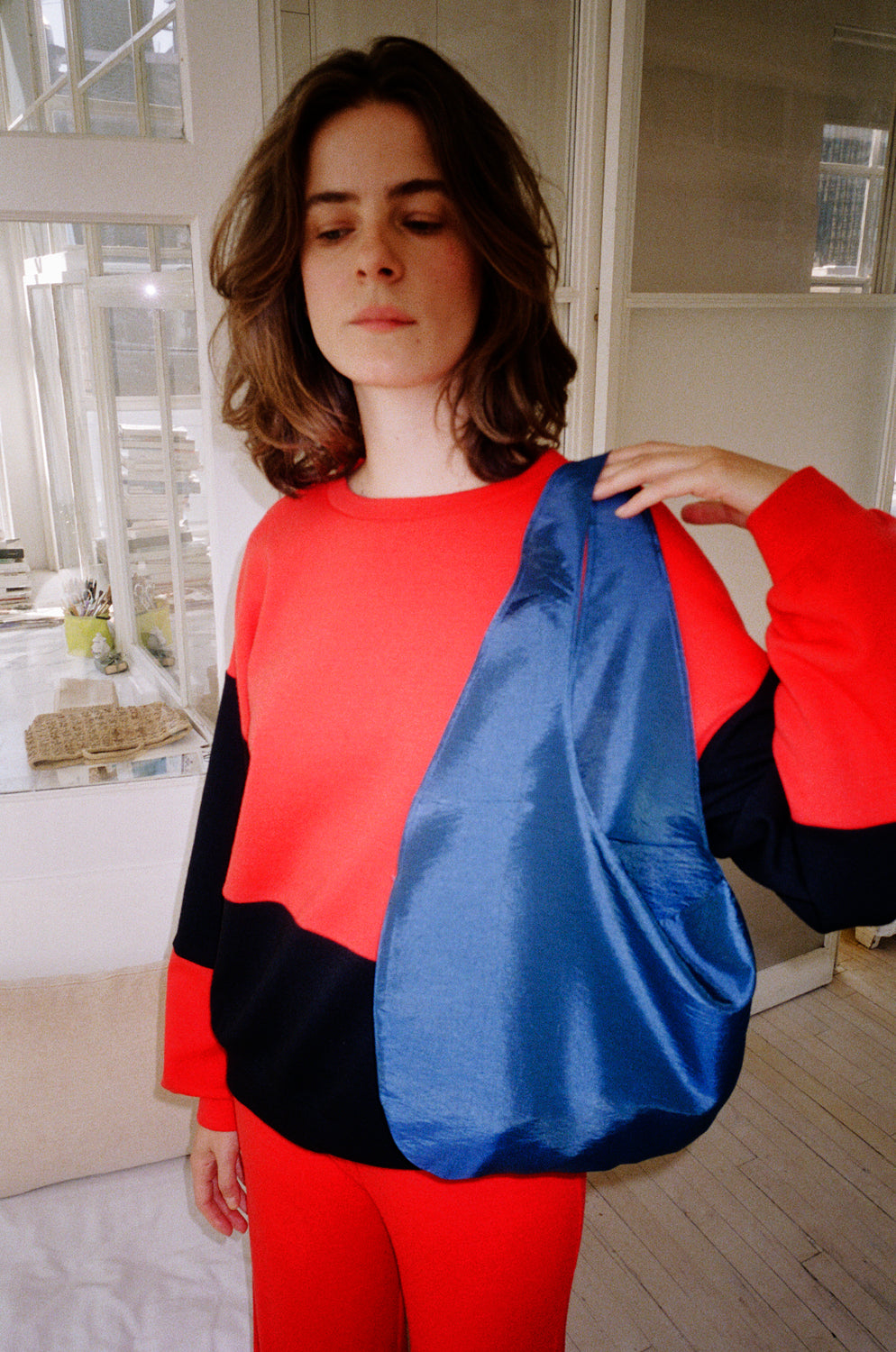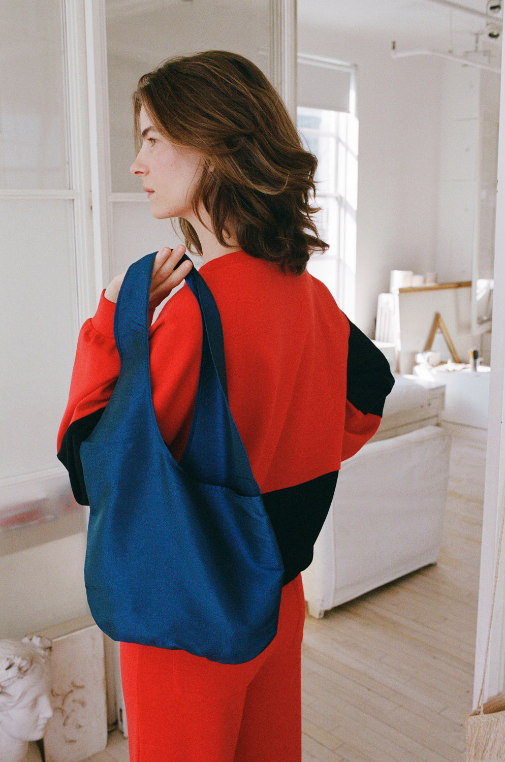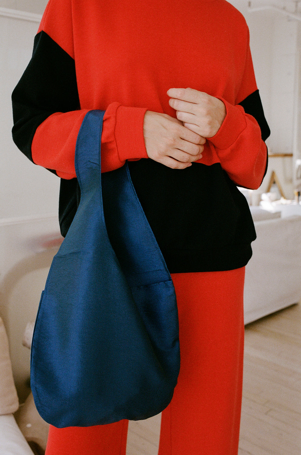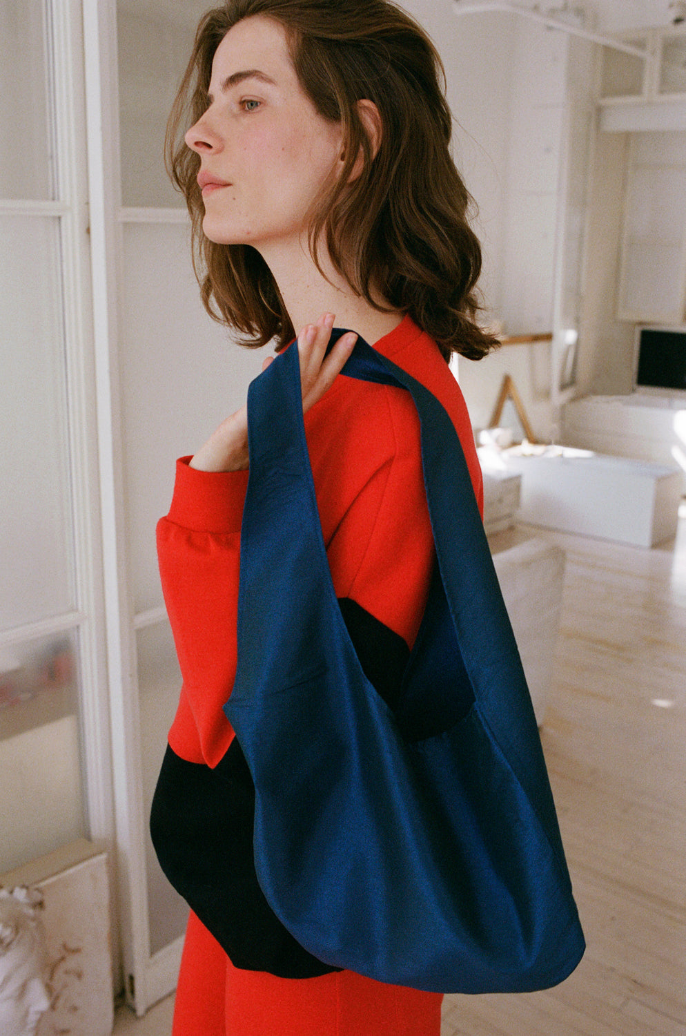 A shoulder tote bag with ovular construction and a wide flat strap.