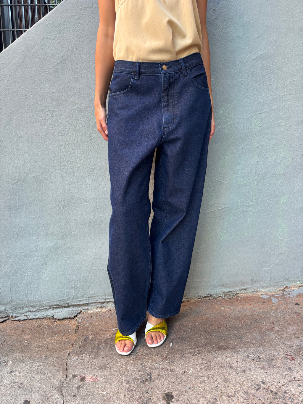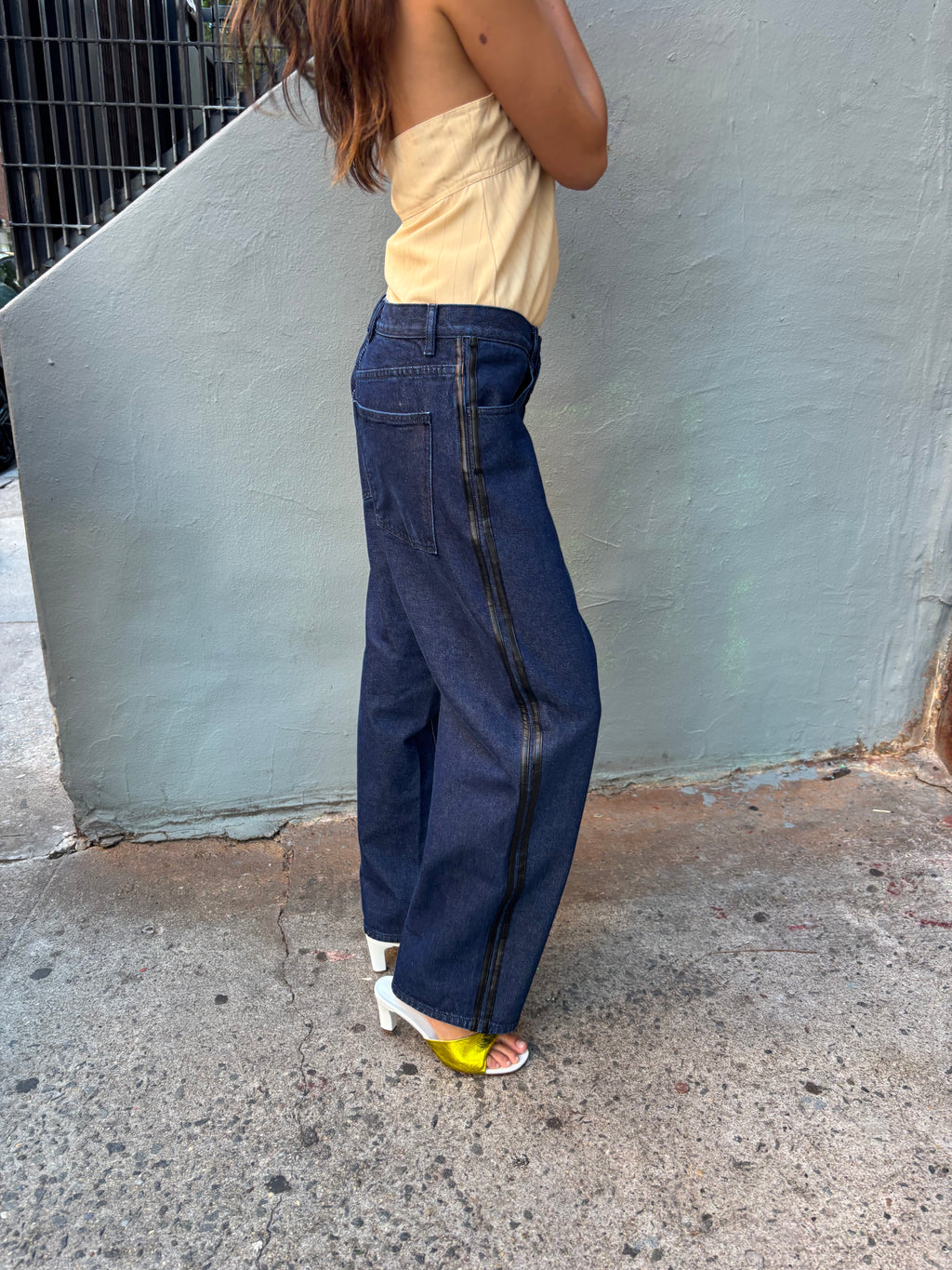 Reworked denim pants with leather striping detail at the side seam. Wide leg, and oversized fit. 5 pocket detail and zip fly. Unisex style.