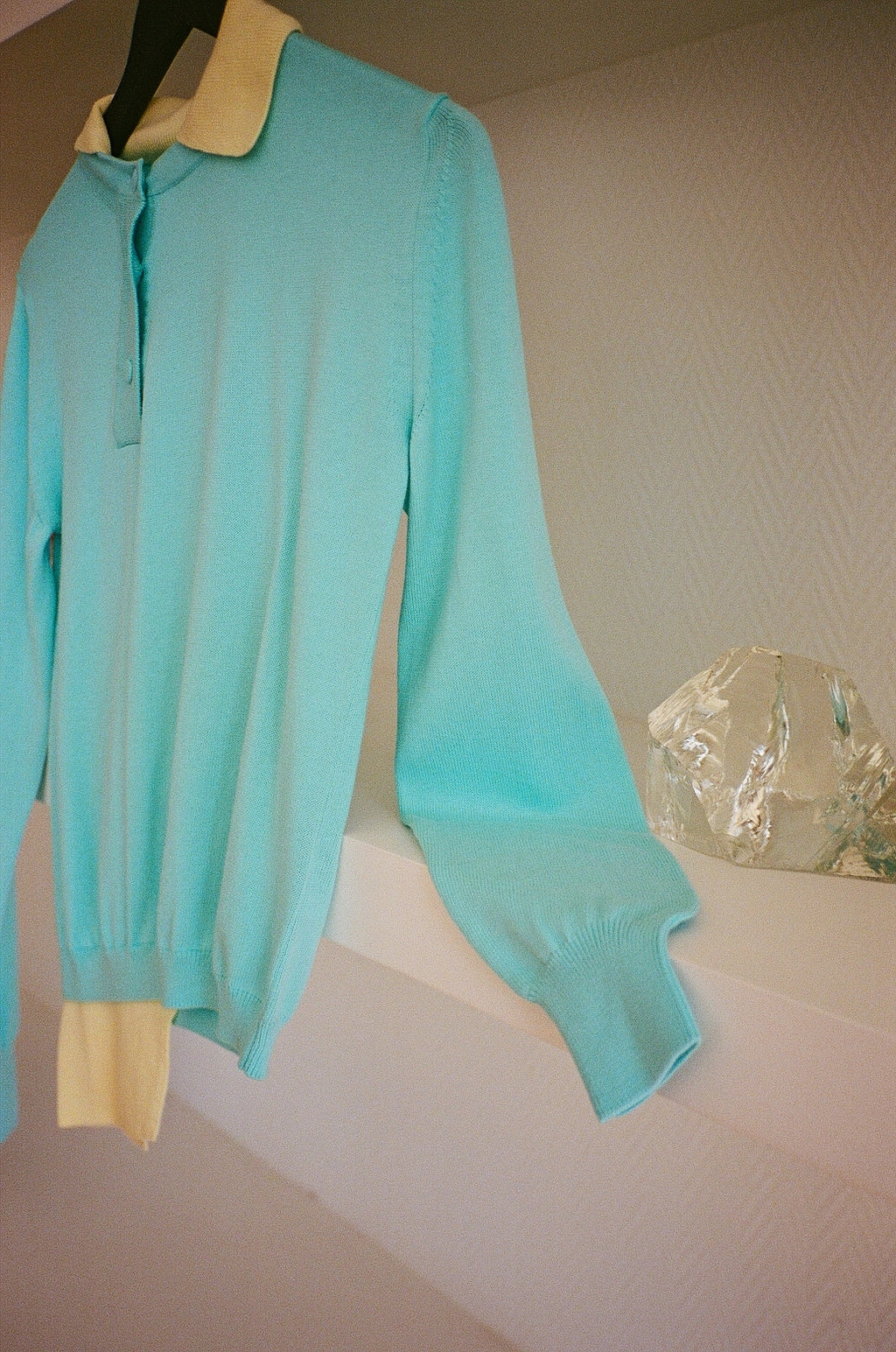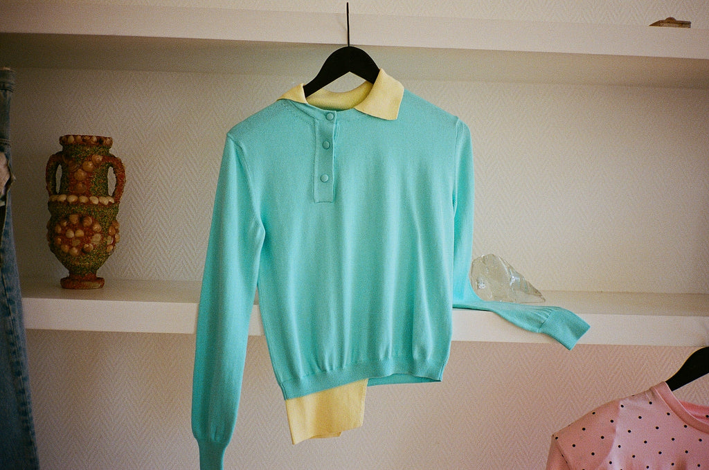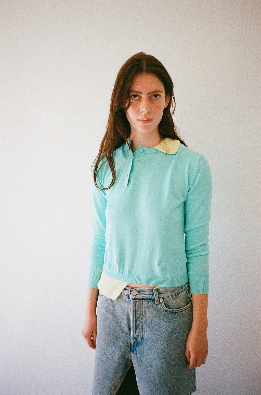 A double-polo styled cotton sweater, with asymmetrical buttons at the front and an off-kilter collar.