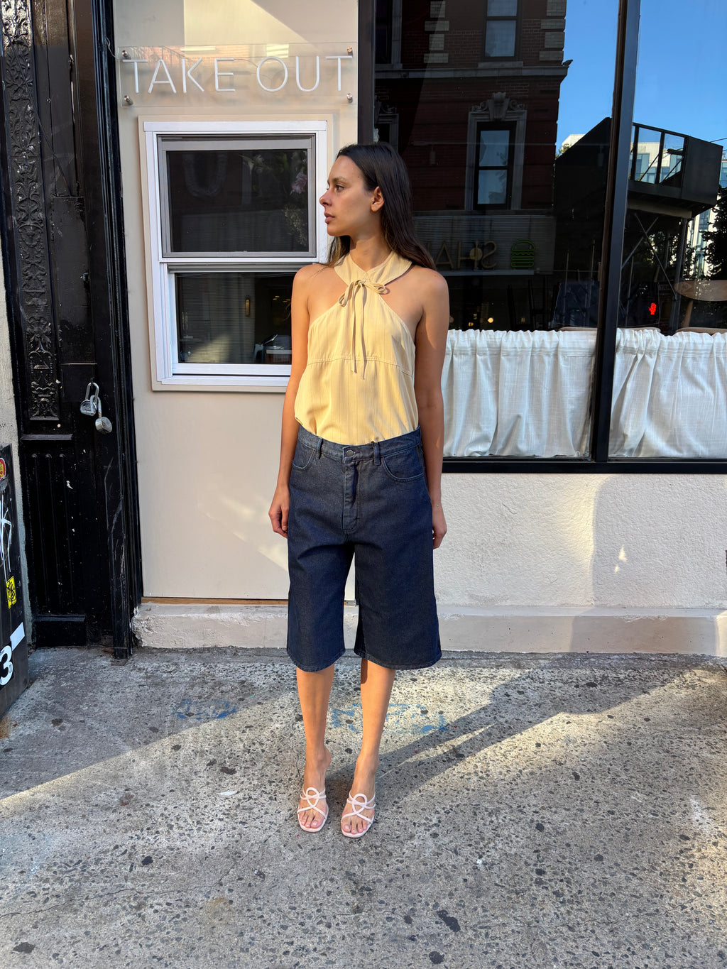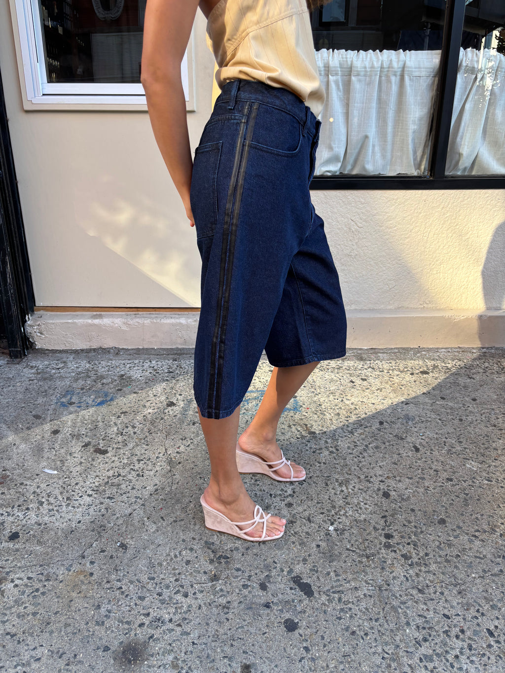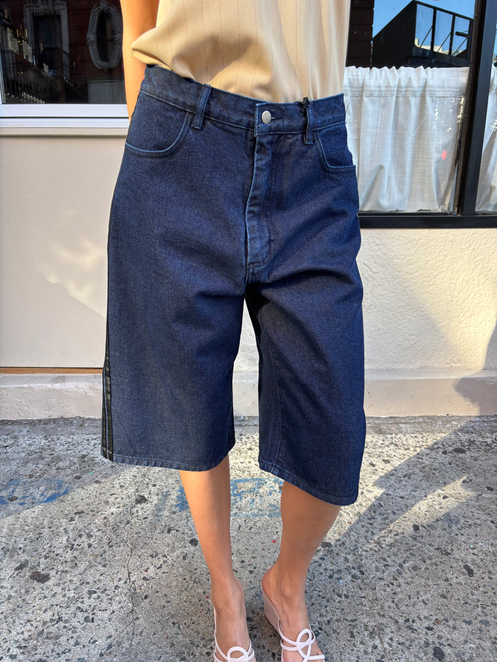 Reworked denim shorts with leather striping detail at the side seam. 5 pocket detail and zip fly. Unisex style.
