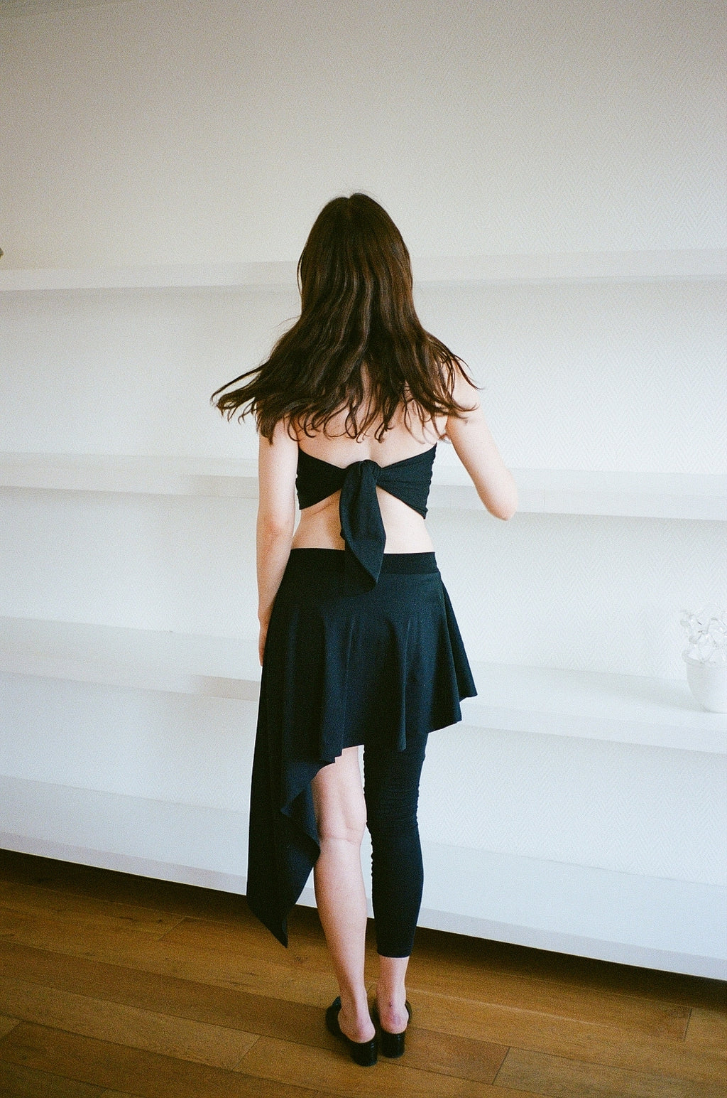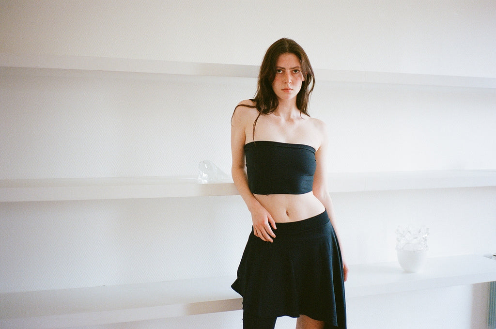 A single-legged pant, with an asymmetrical skirt and a fitted elastic waist.