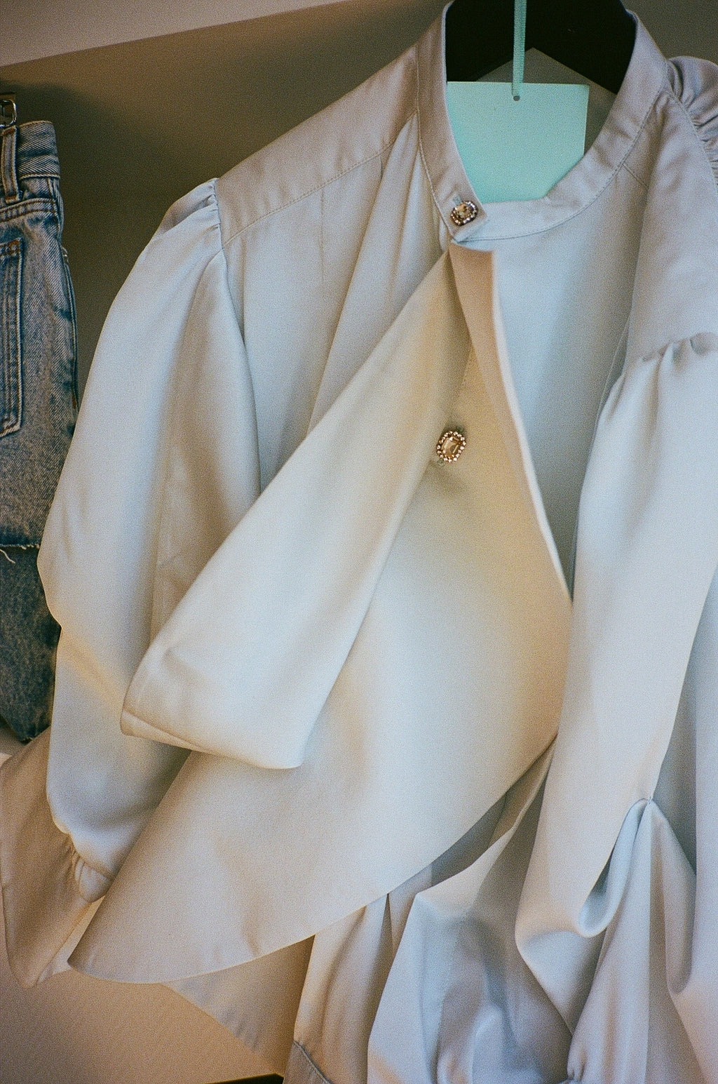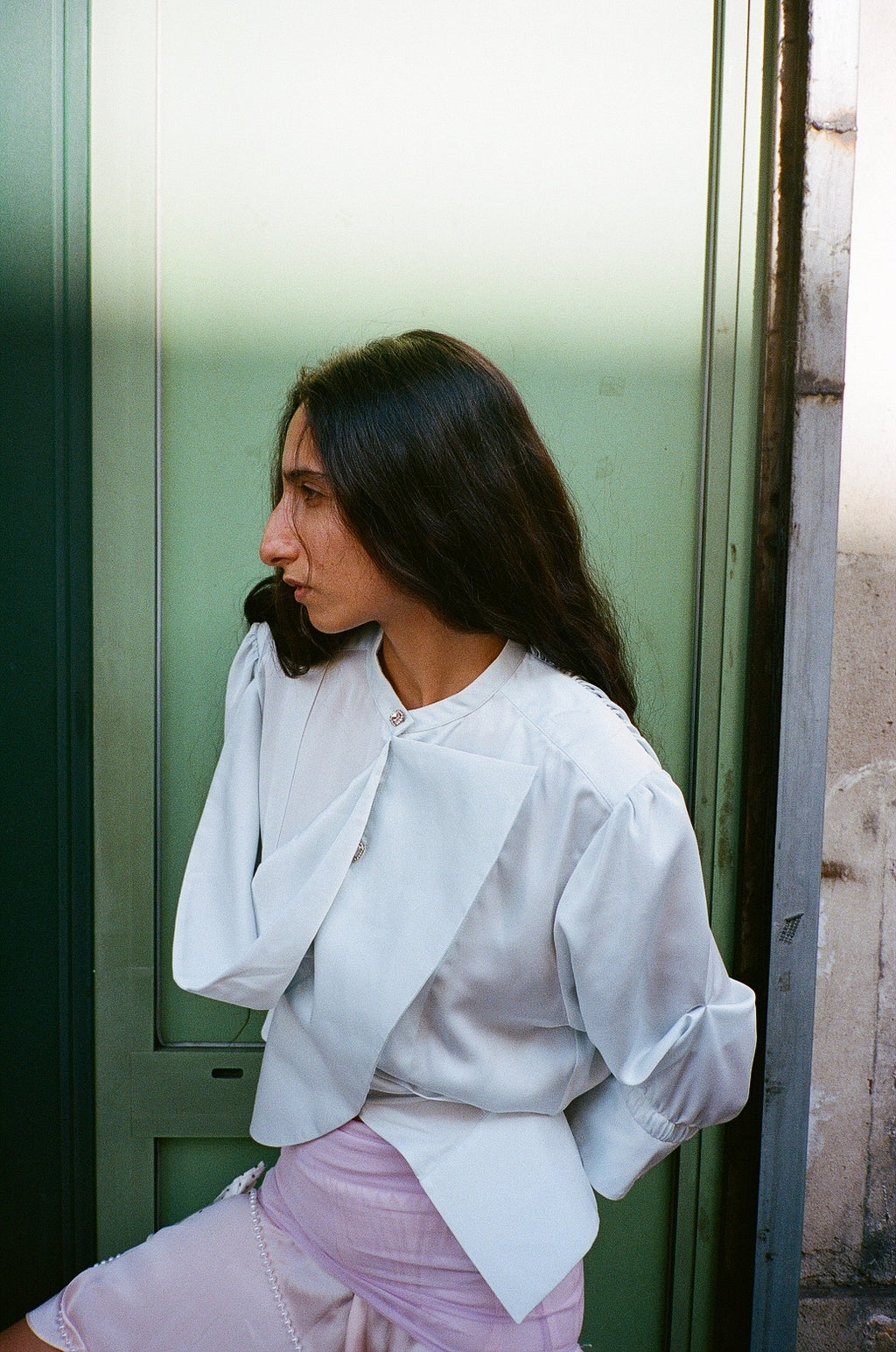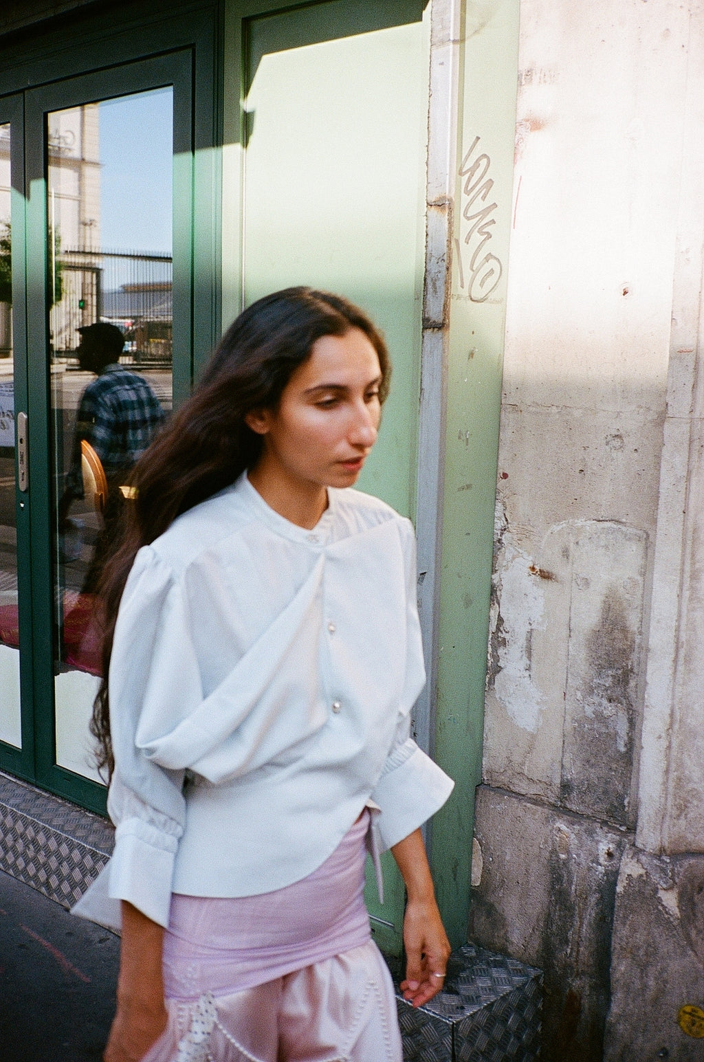 An asymmetrical "twisted" blouse with panelling and crystal buttons.