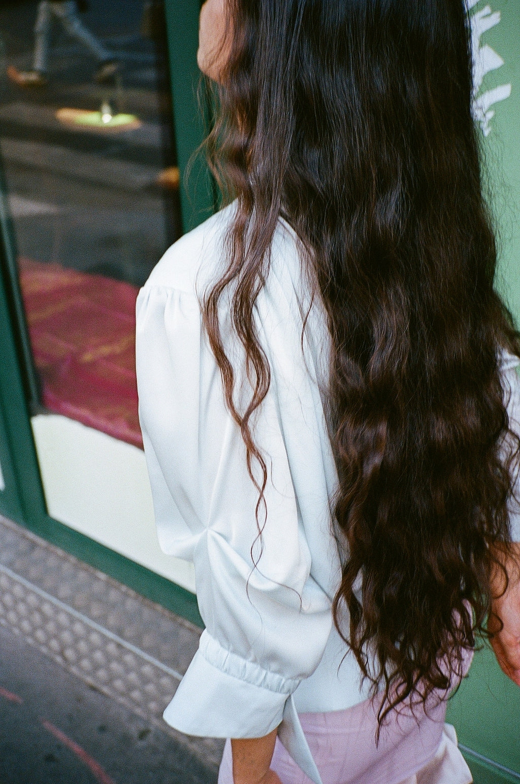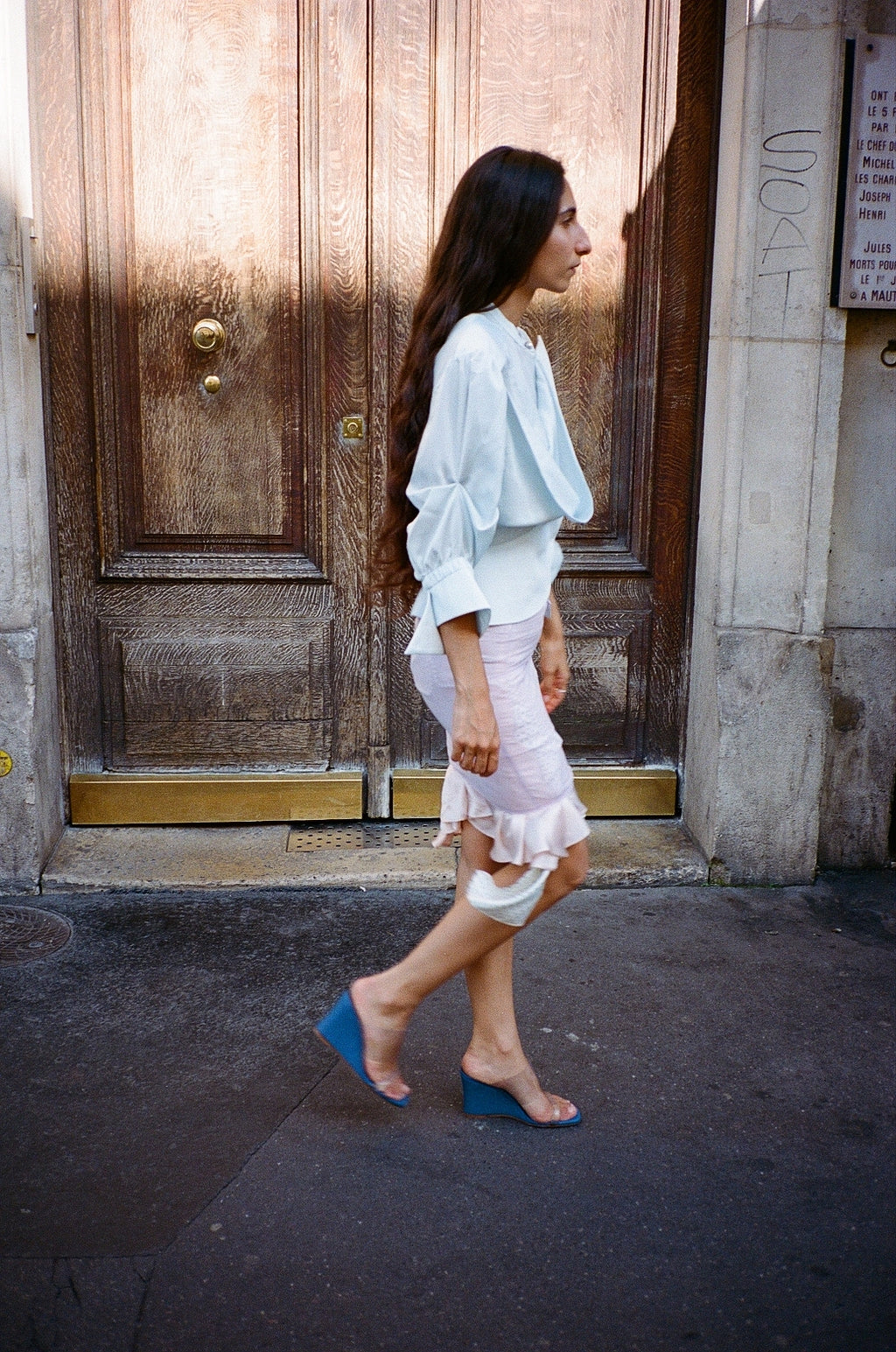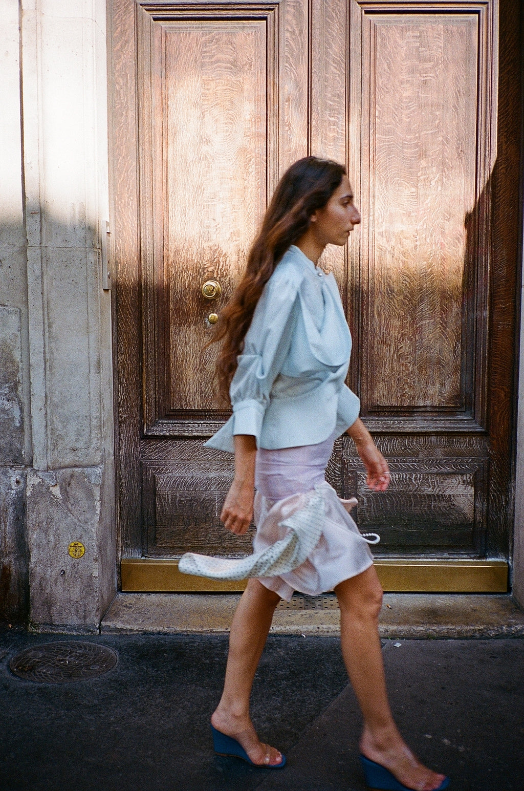 An asymmetrical "twisted" blouse with panelling and crystal buttons.