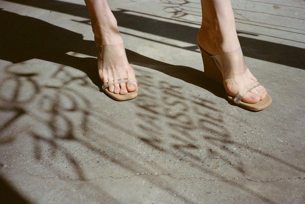 High wedges with two clear perspex bands. 8cm heel. Fits true to size.