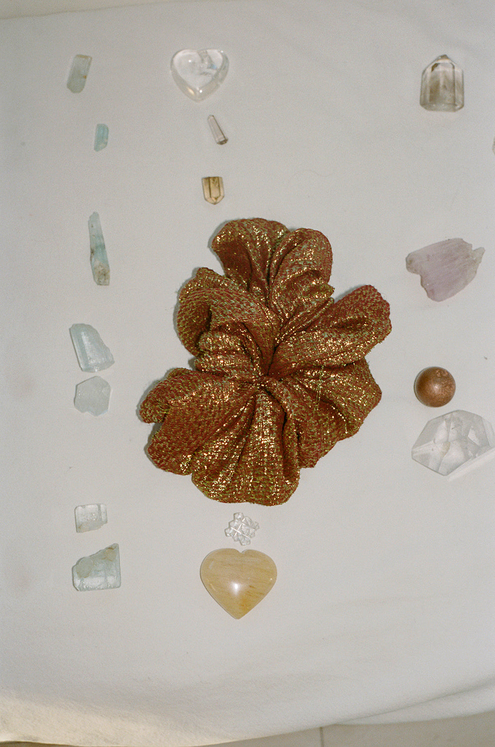 A gathered cotton scrunchie. To be worn in the hair or adorned on the wrist.