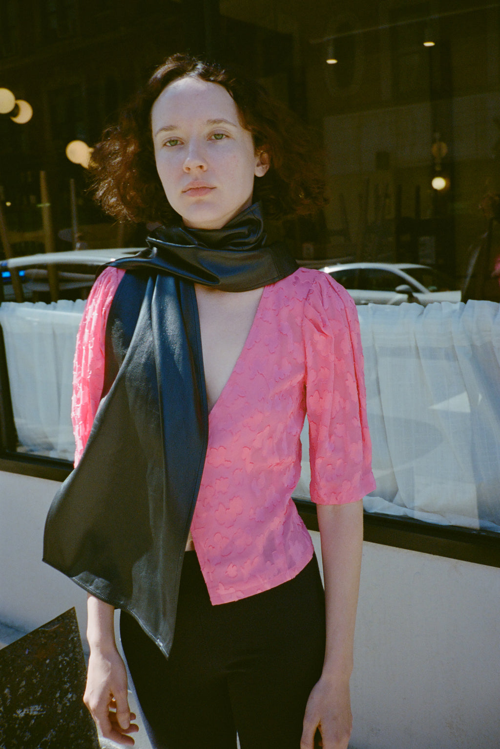 Loose puffed sleeve blouse with a deep V-neck and one button closure.