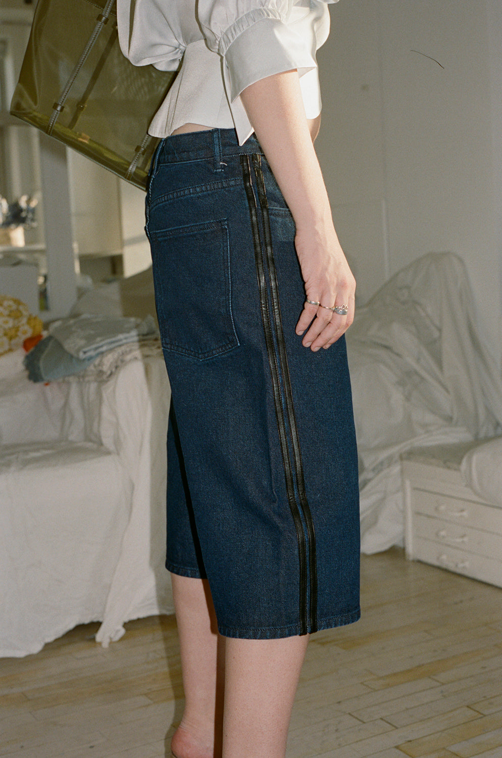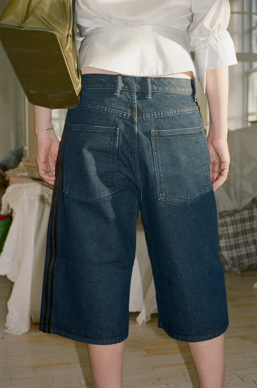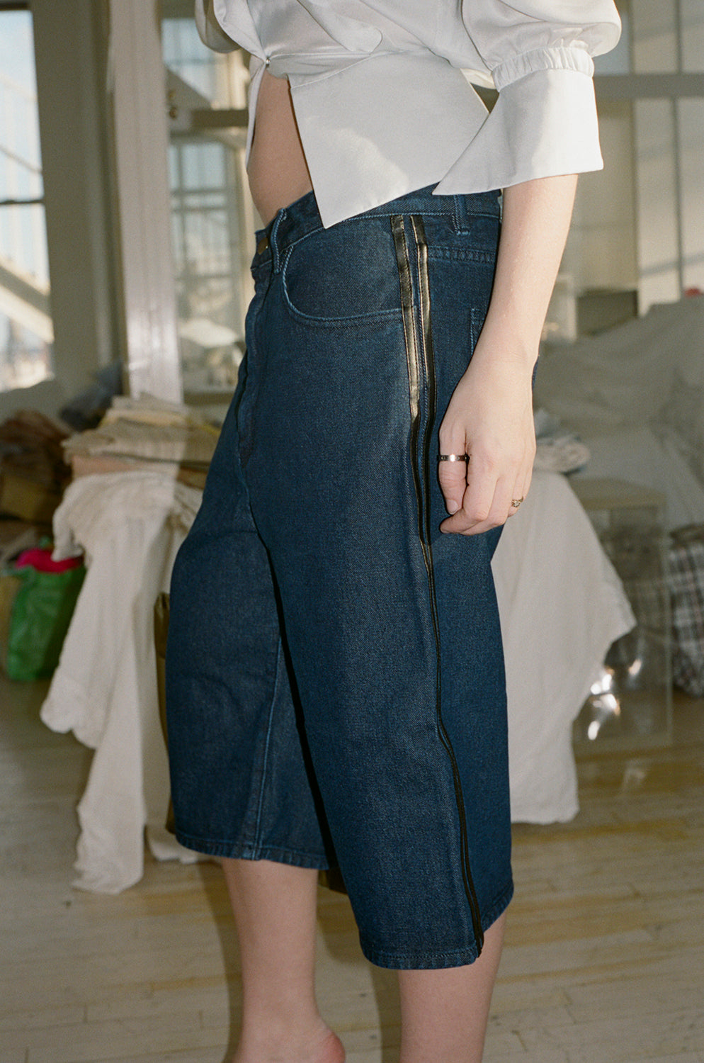 Reworked denim shorts with leather striping detail at the side seam. 5 pocket detail and zip fly. Unisex style.