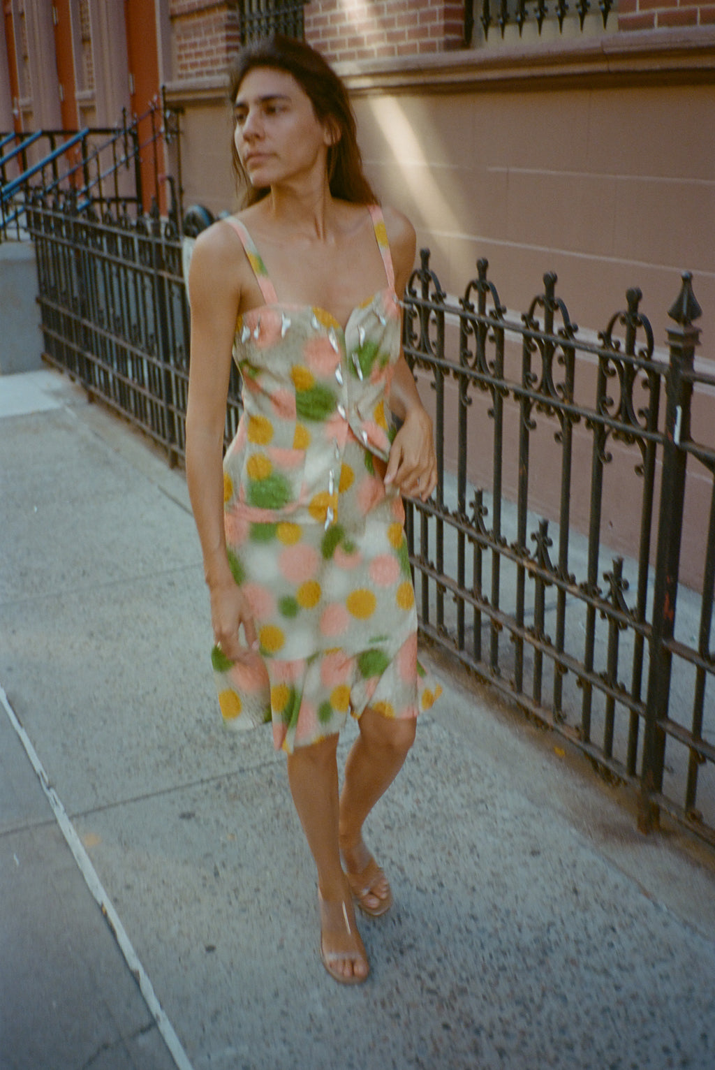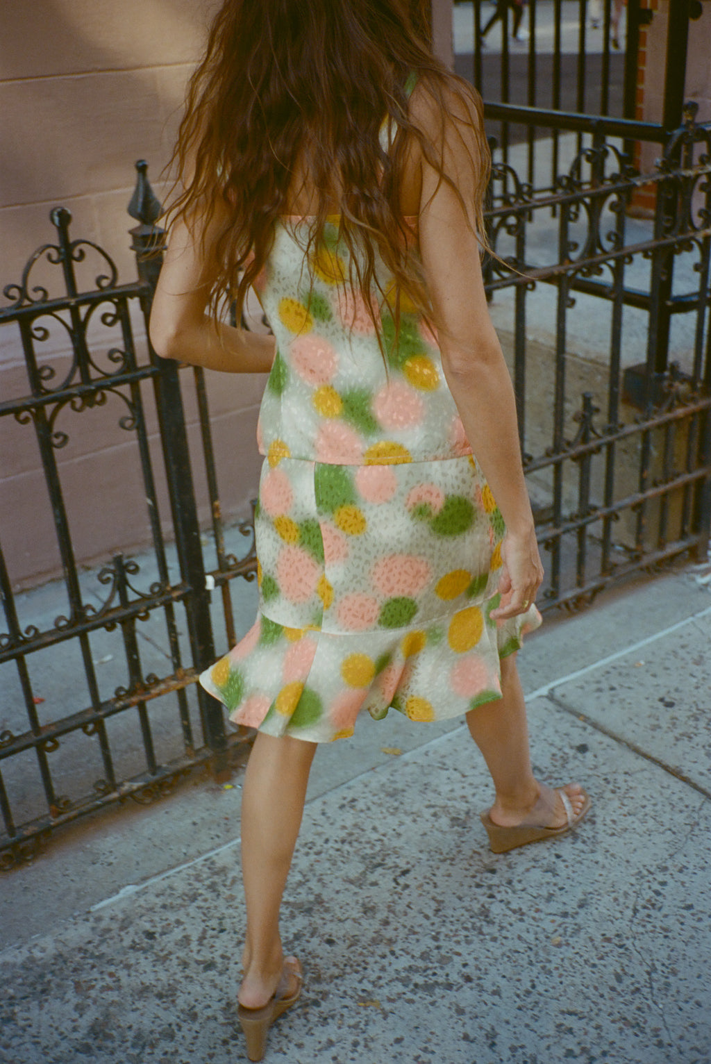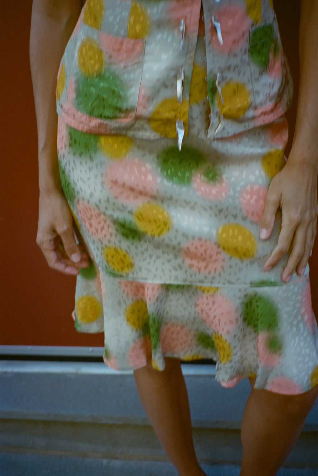Knee length skirt with flounce detail at the bottom, zip closure at back.