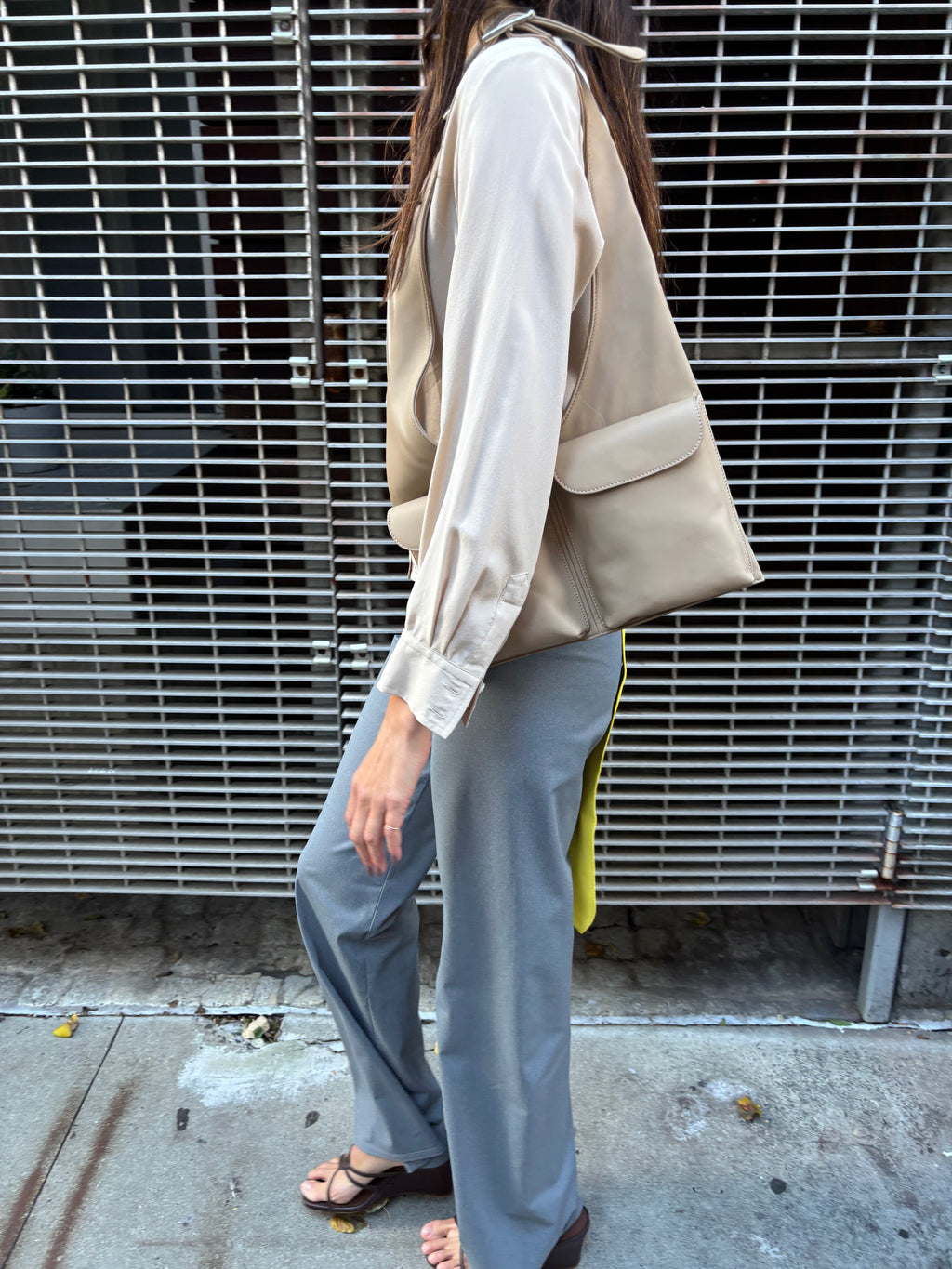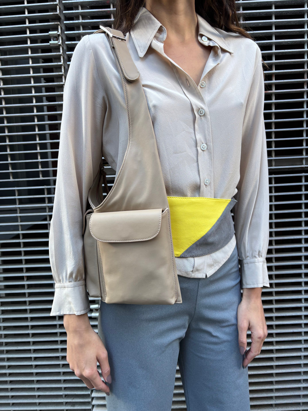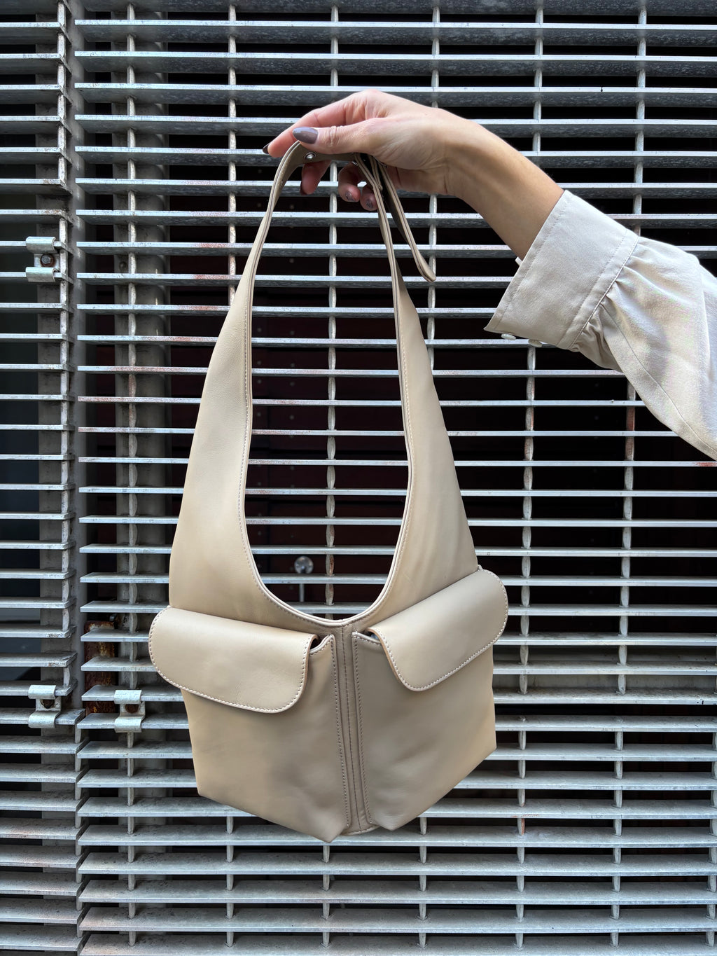 A flat shoulder bag featuring two flap patch pockets with snap fastenings. Zipper compartments at opposite side. Adjustable buckled shoulder strap. Silver-toned hardware.