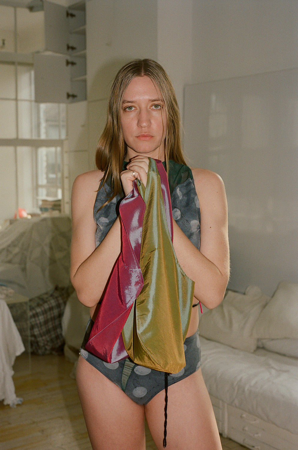 A shoulder tote bag with ovular construction and a wide flat strap.