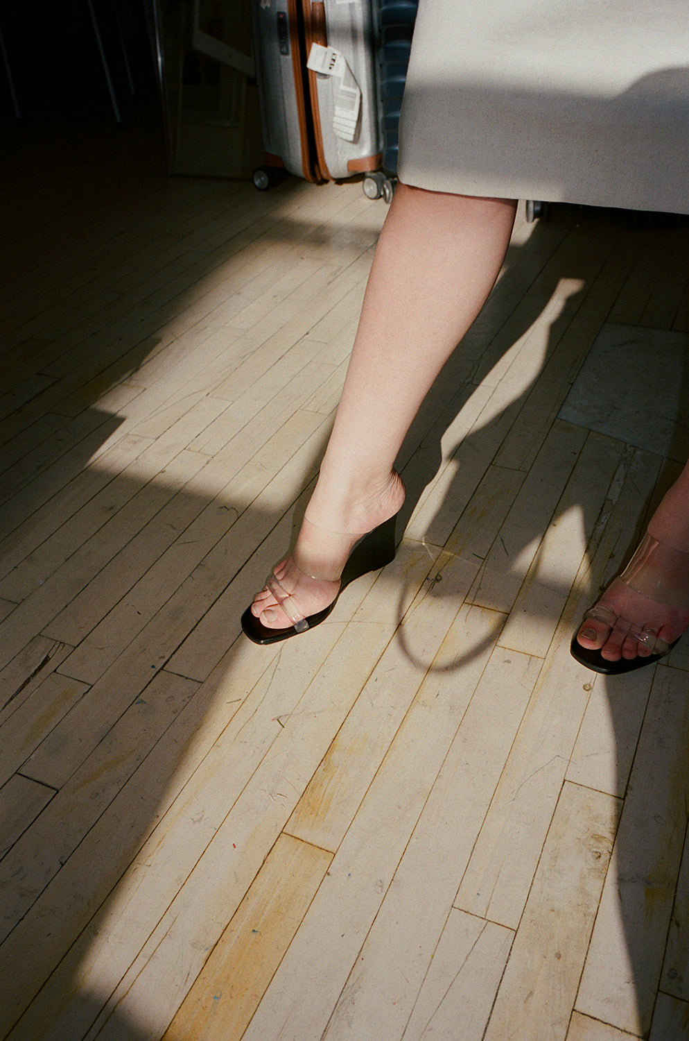 High wedges with two clear perspex bands. 8cm heel. Fits true to size.
