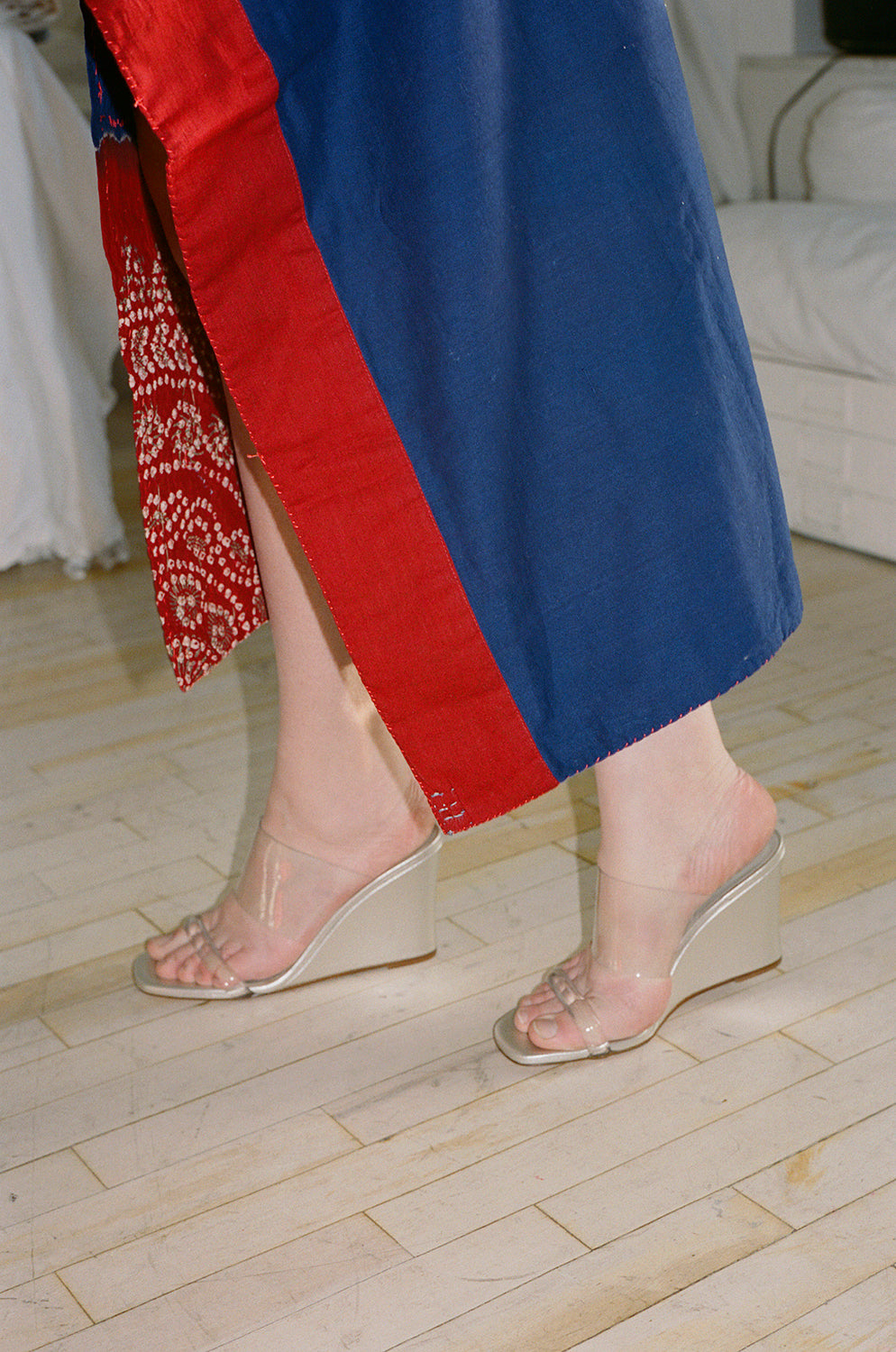High wedges with two clear perspex bands. 8cm heel. Fits true to size.