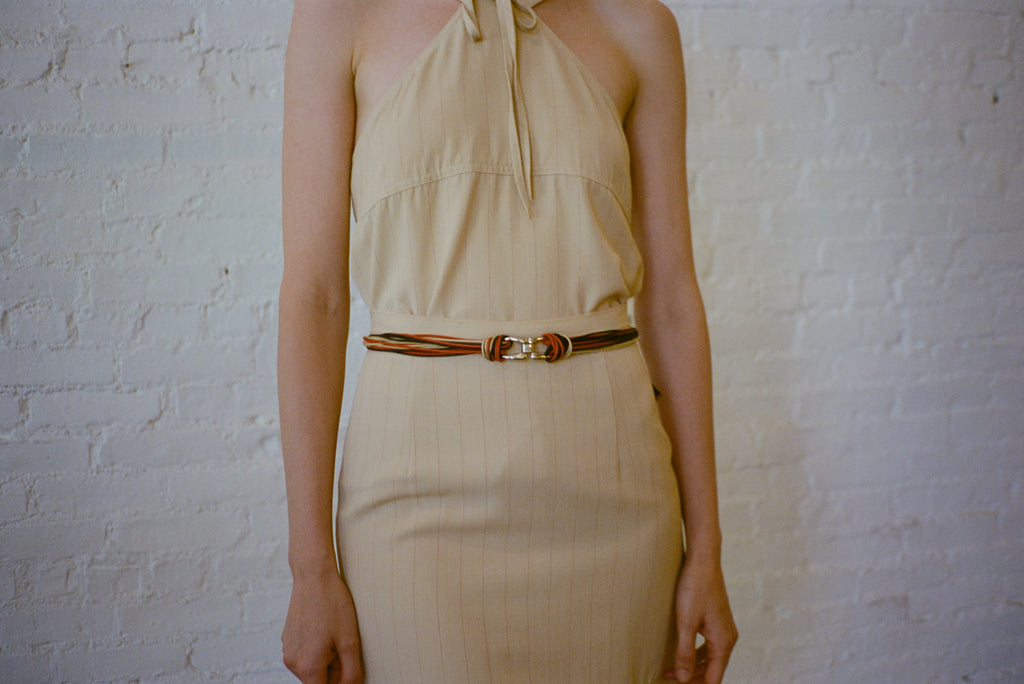 Multi leather strand belt in red and black with a silver pendant at center front and tie closure.