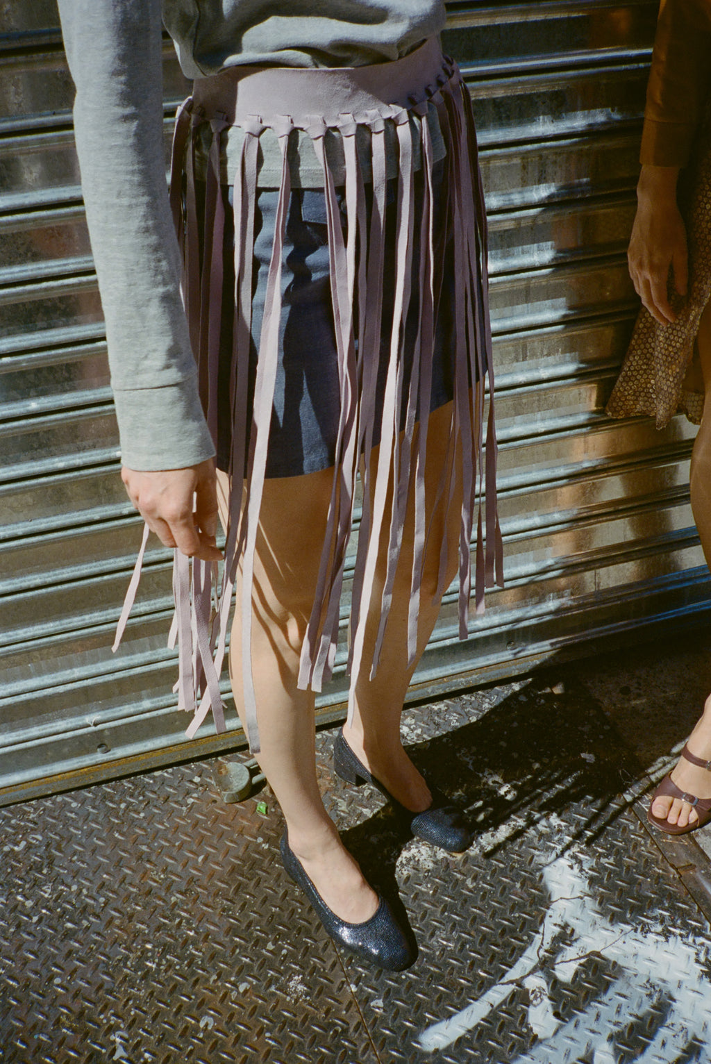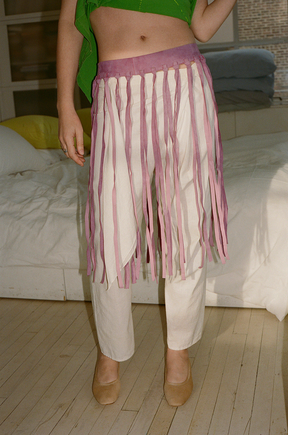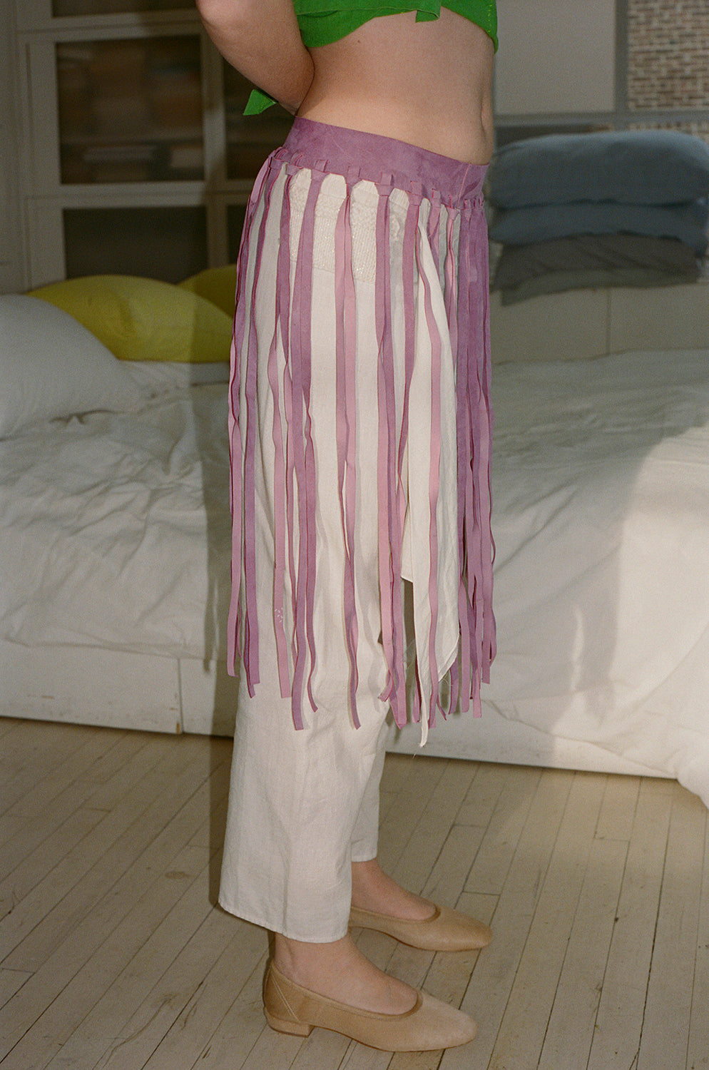 Suede fringe belt with snap closure.