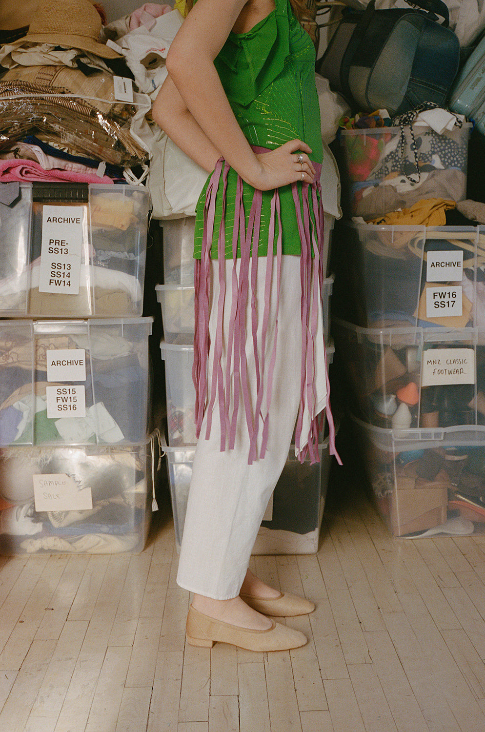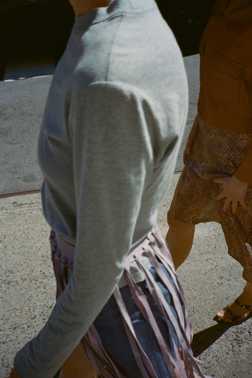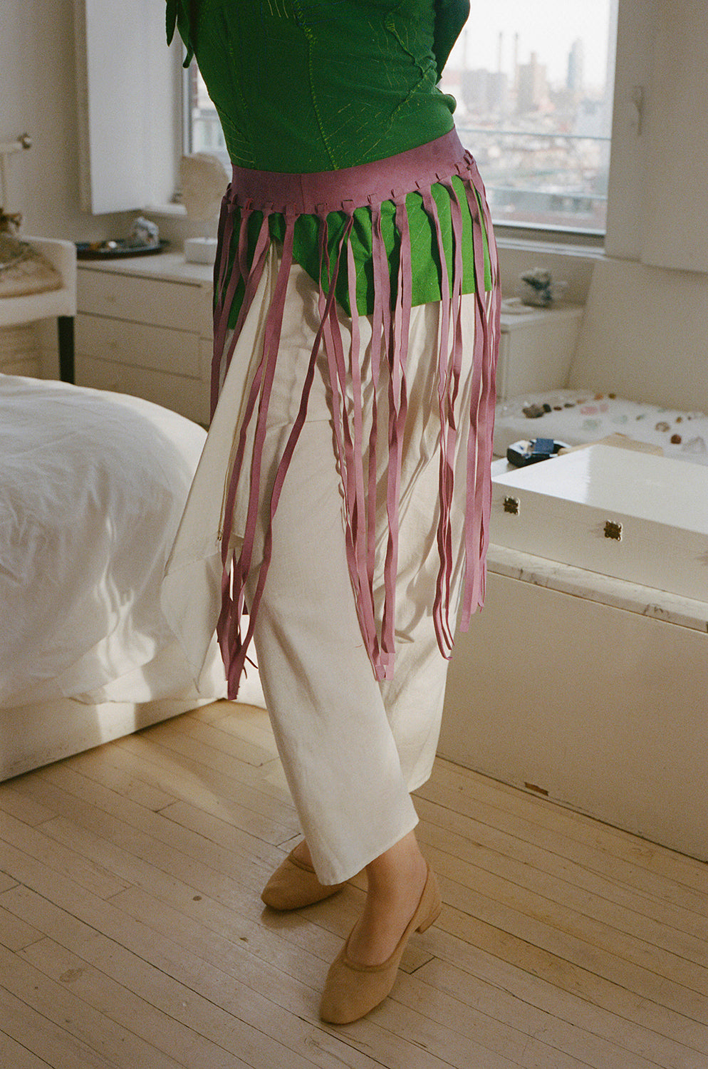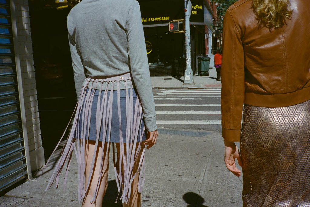 Suede fringe belt with snap closure.