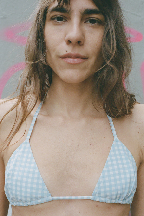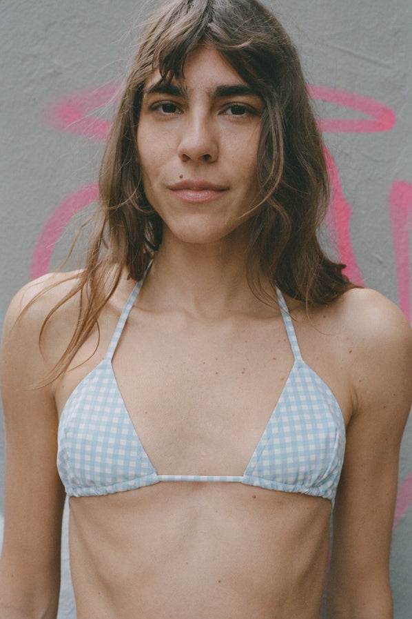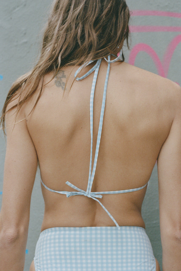 A halter bikini with adjustable tie straps and high-cut bottoms. Runs small size up 2 sizes.
