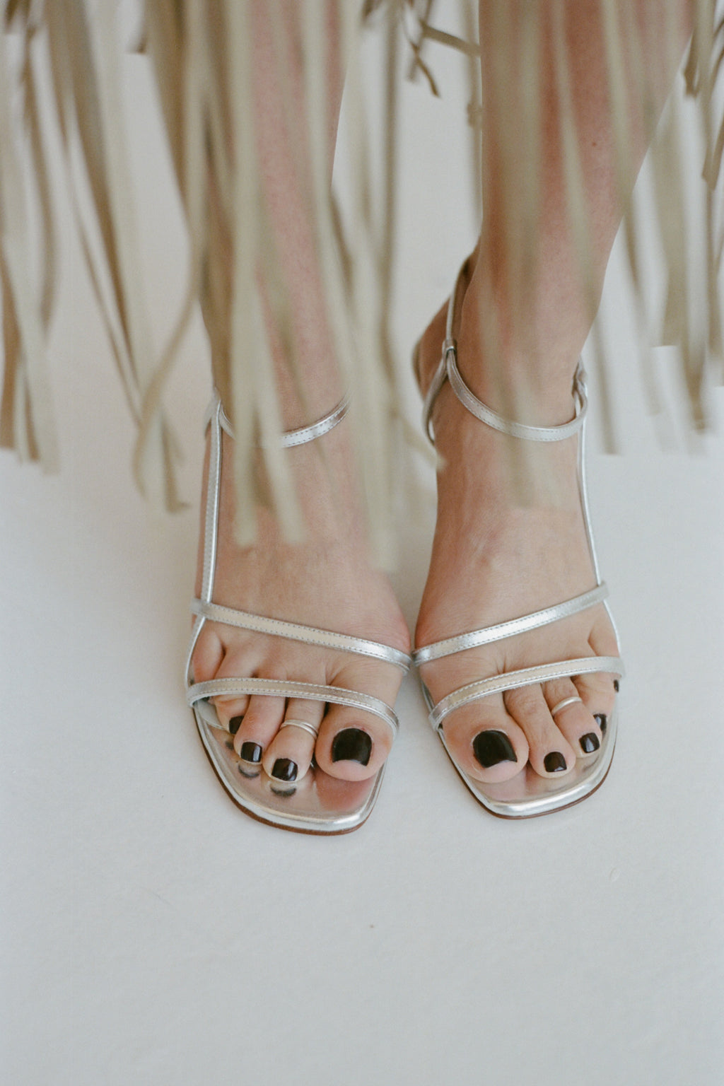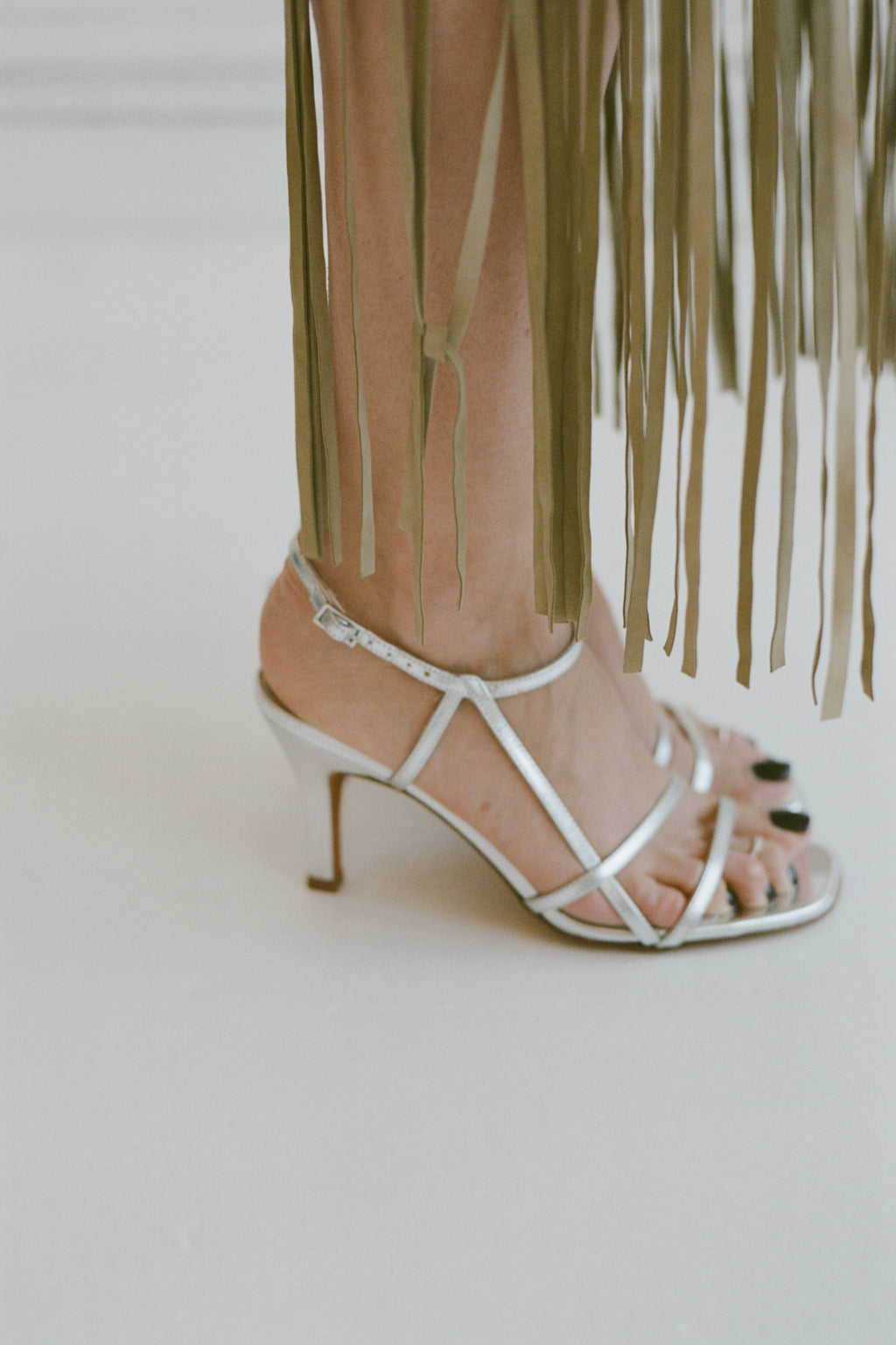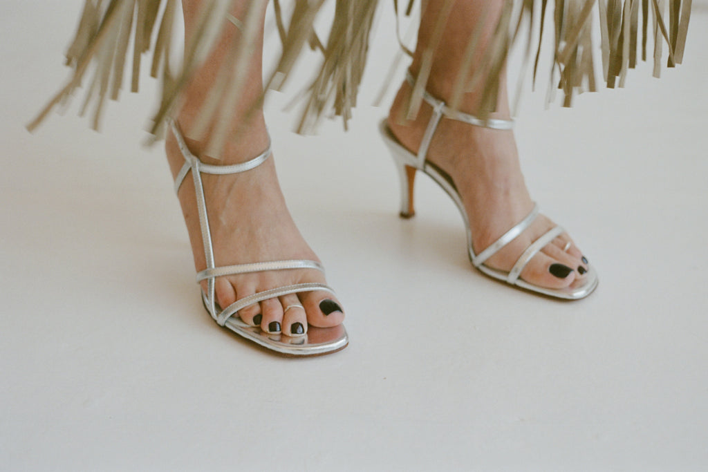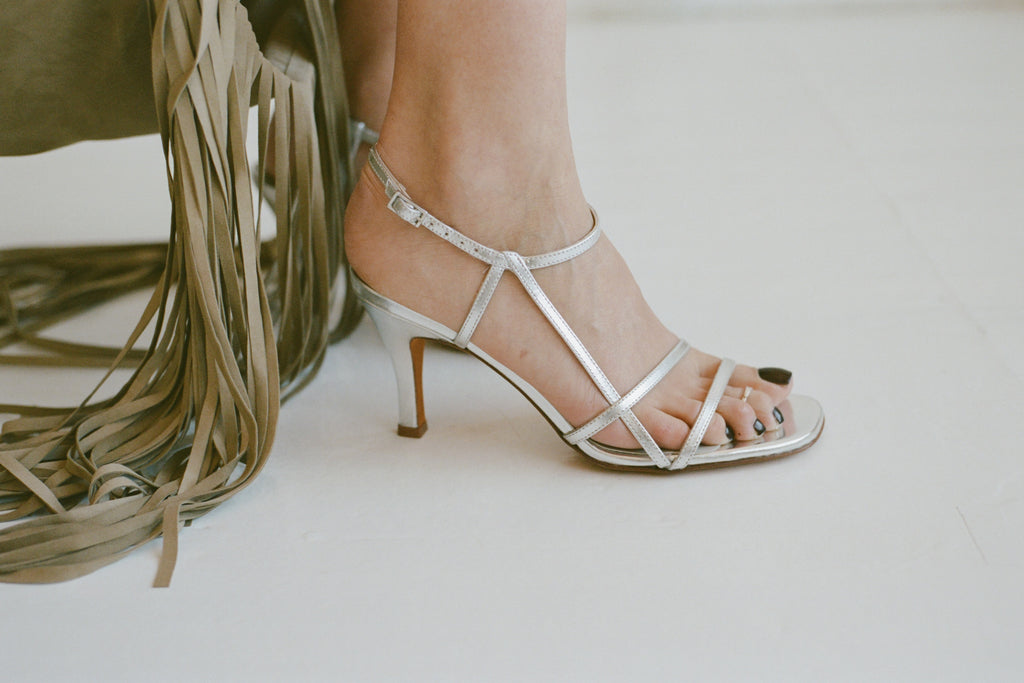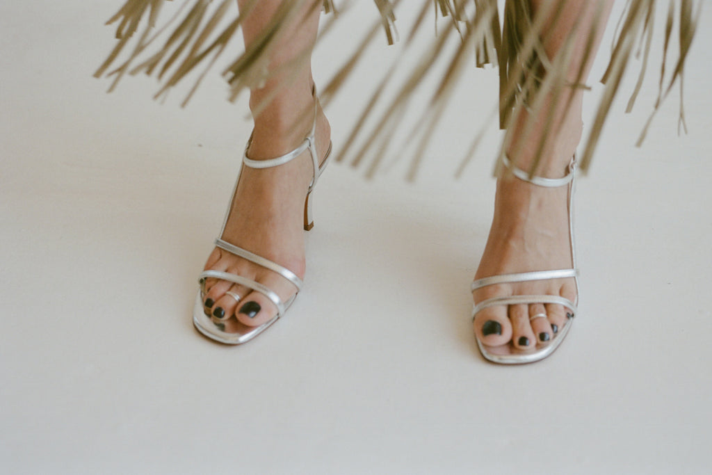 A stiletto sandal with thin straps across the toes. Adjustable buckle ankle strap in silver-toned hardware. 8cm heel height. Fits true to size.
