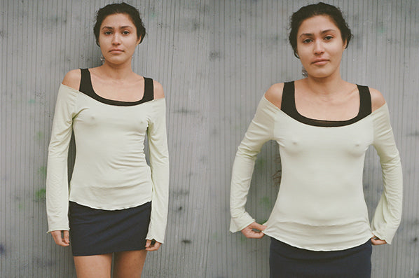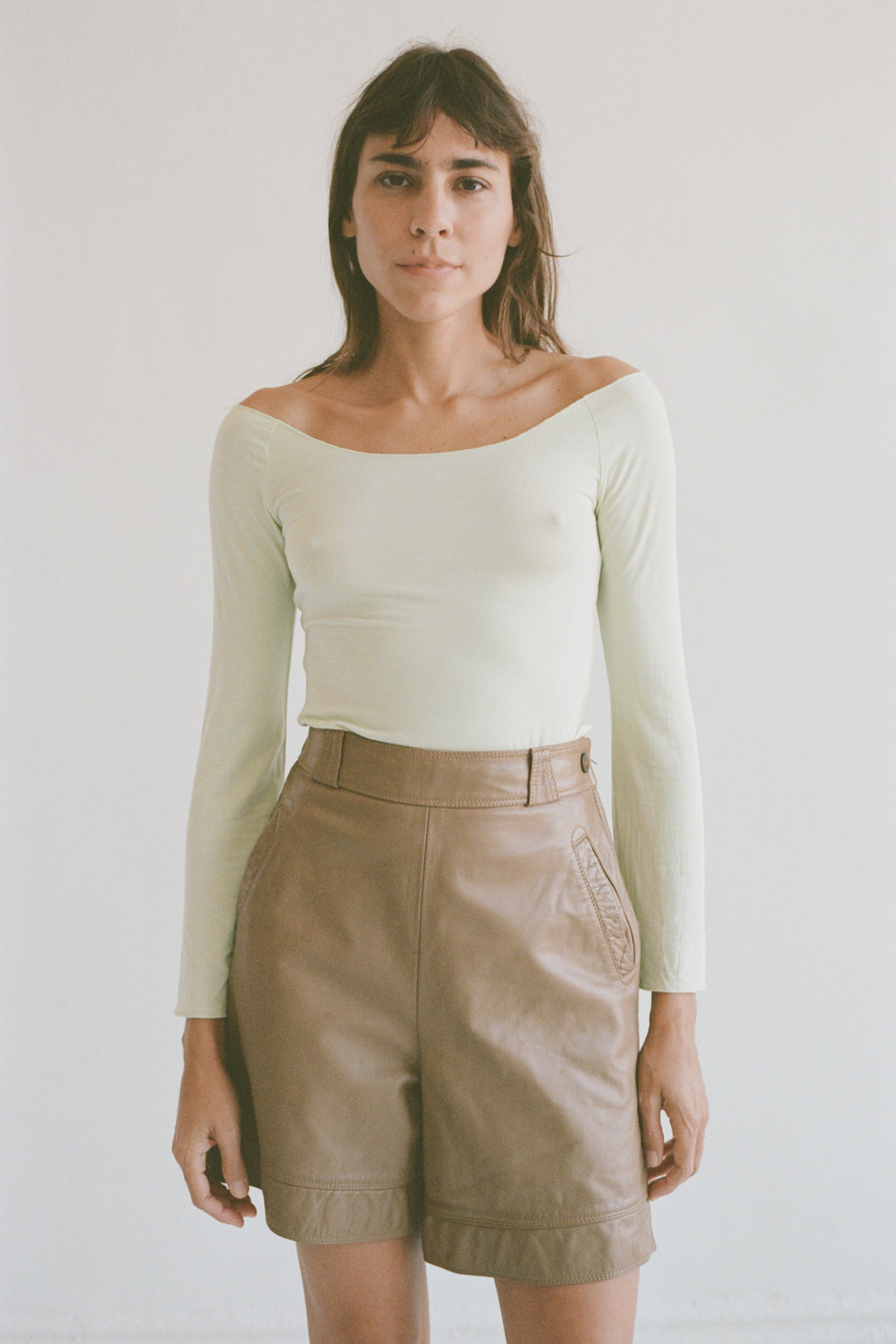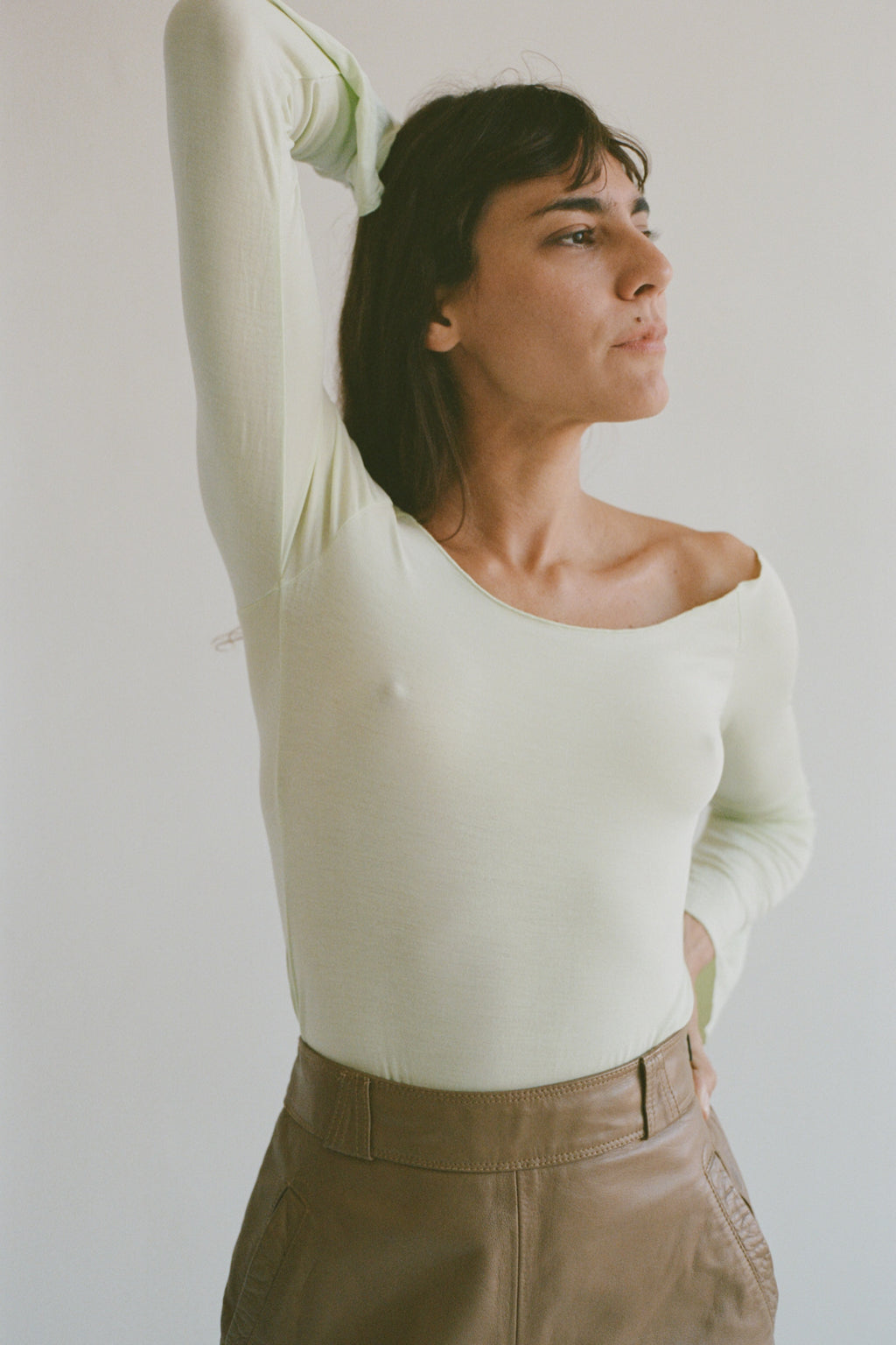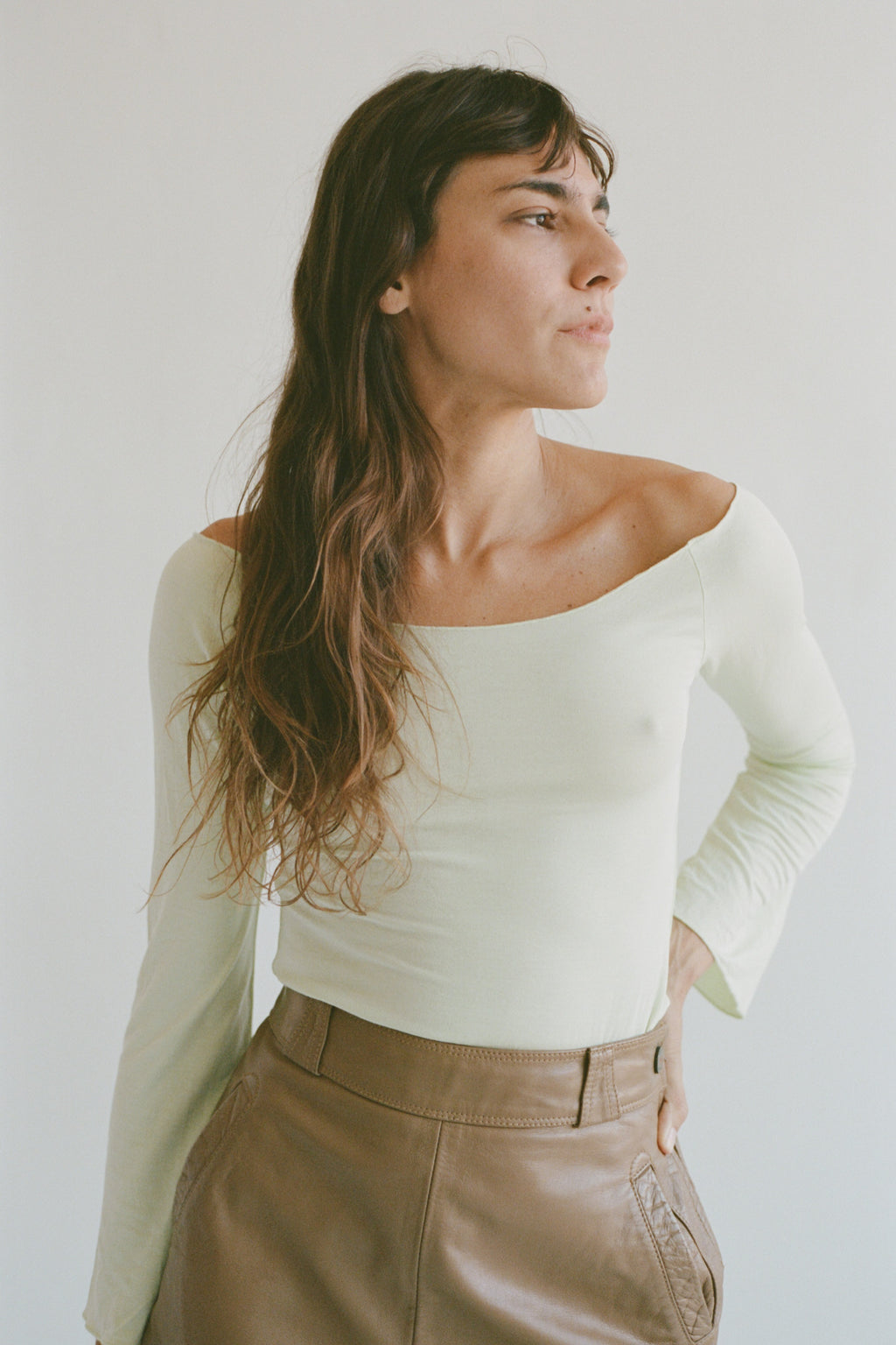 A long sleeve, off-the shoulder shirt with flared sleeves and fitted body. Super soft material.