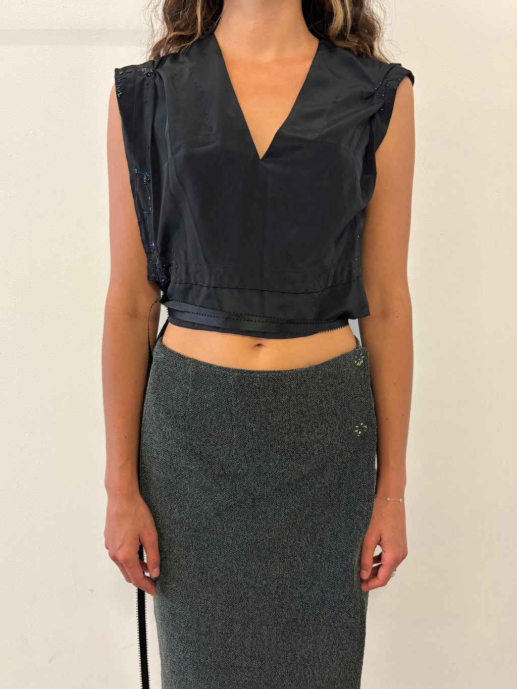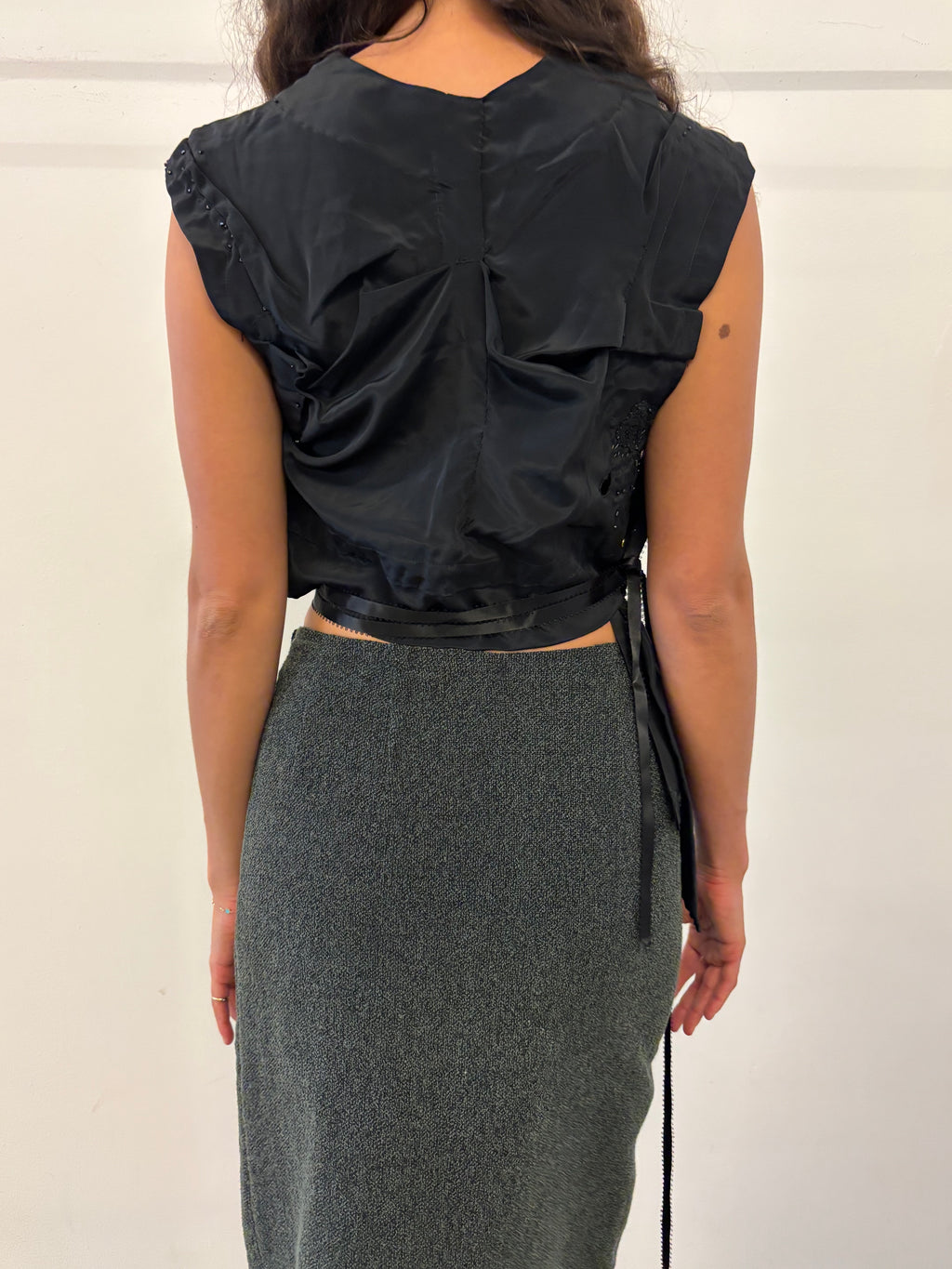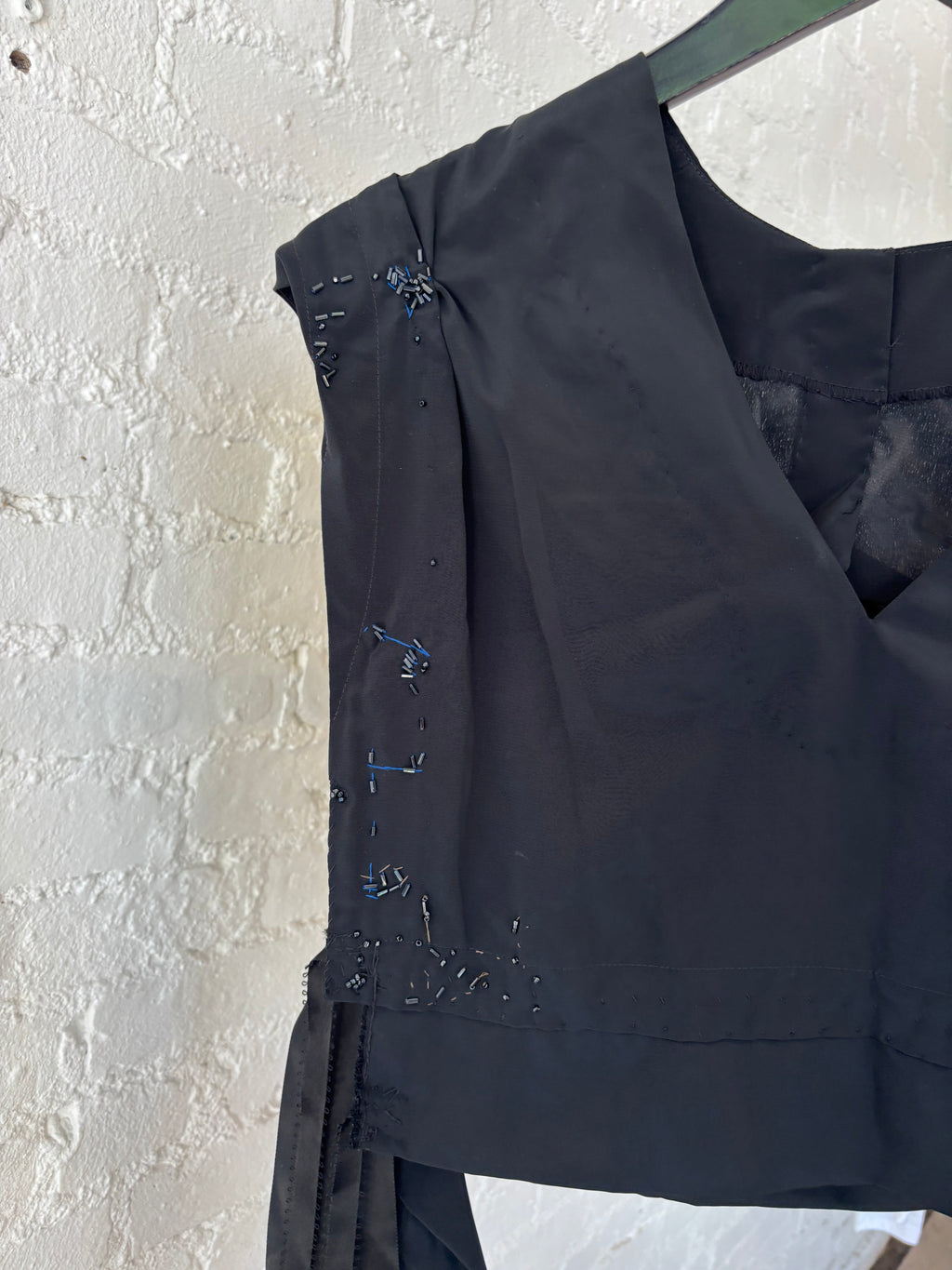Black silk v-neck blouse in a cropped length. Has embellishment throughout and a side ribbon tie.