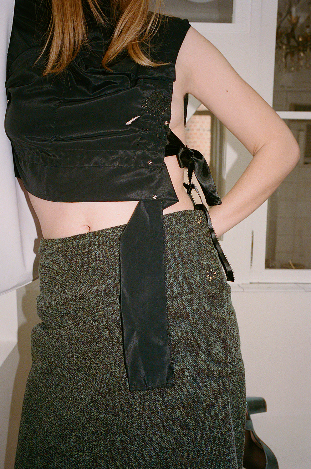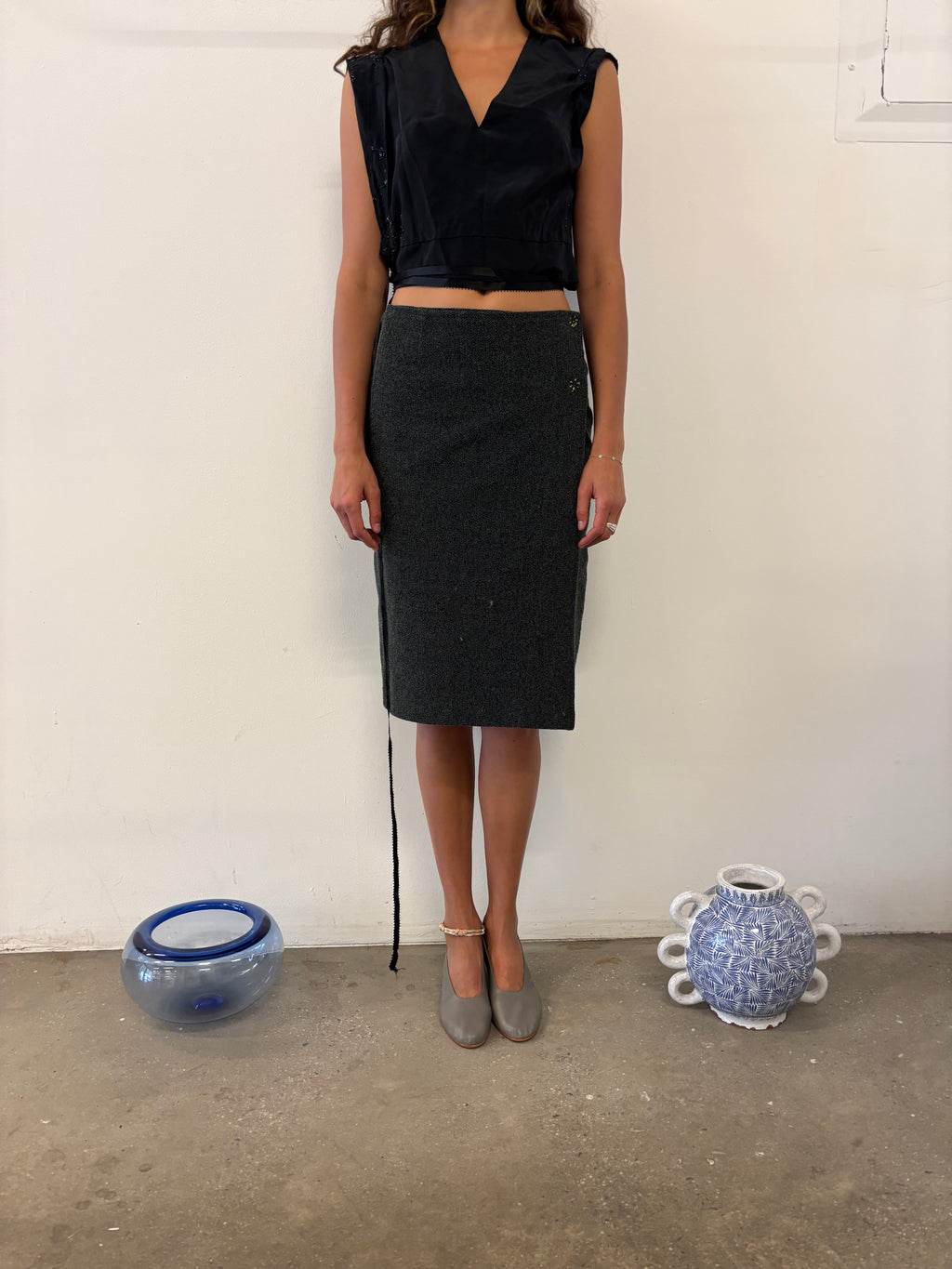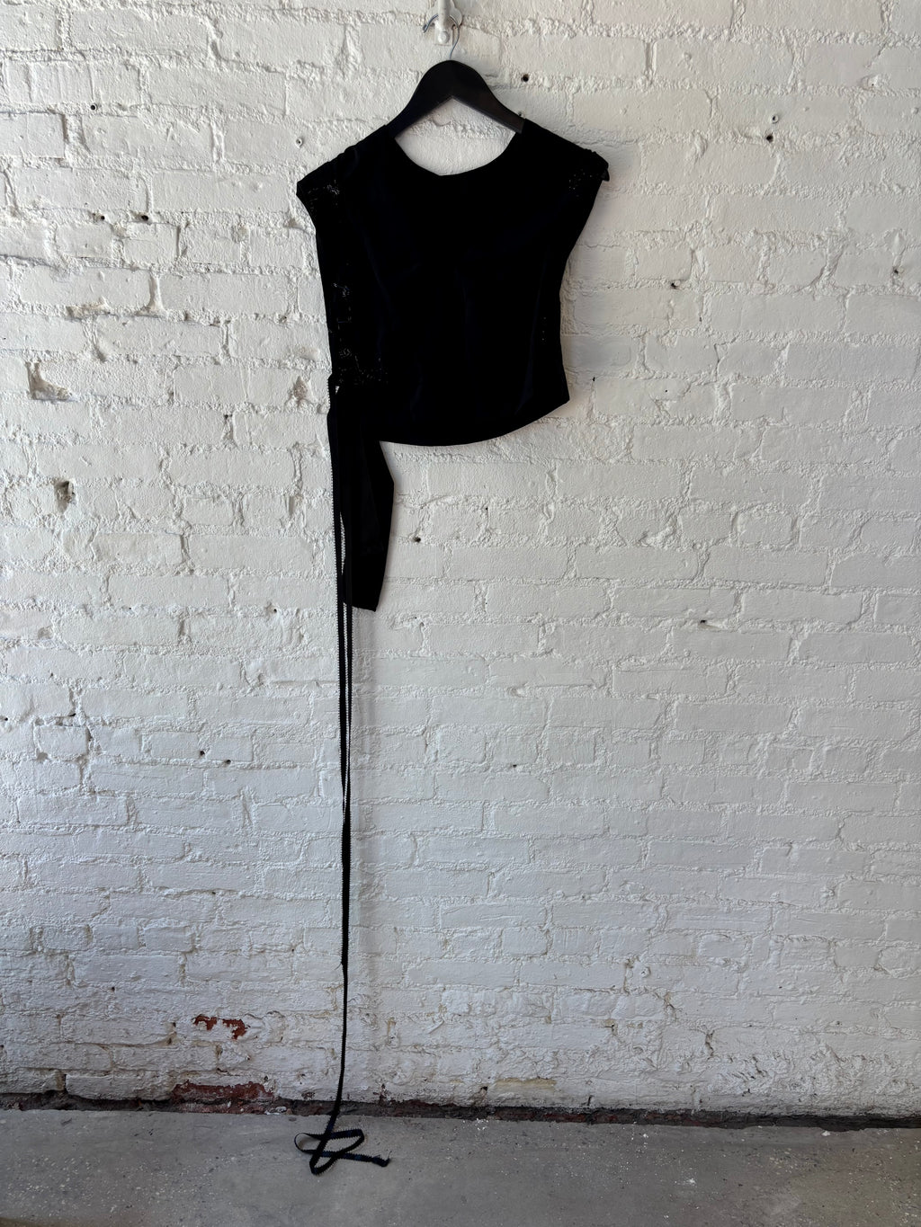 Black silk v-neck blouse in a cropped length. Has embellishment throughout and a side ribbon tie.