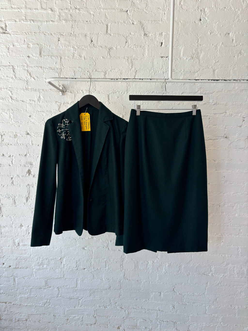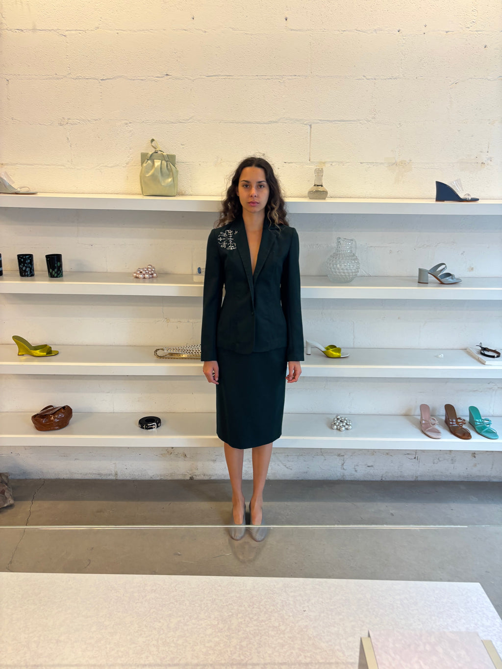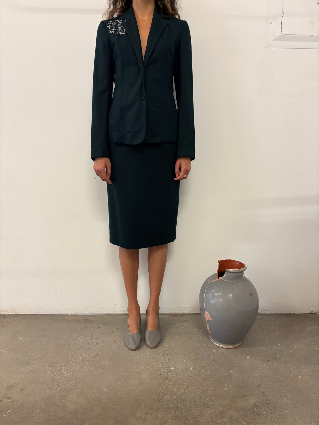 Dark green skirt suit with embroidery detail on wearer's right chest.