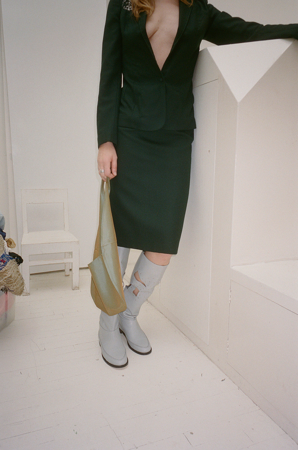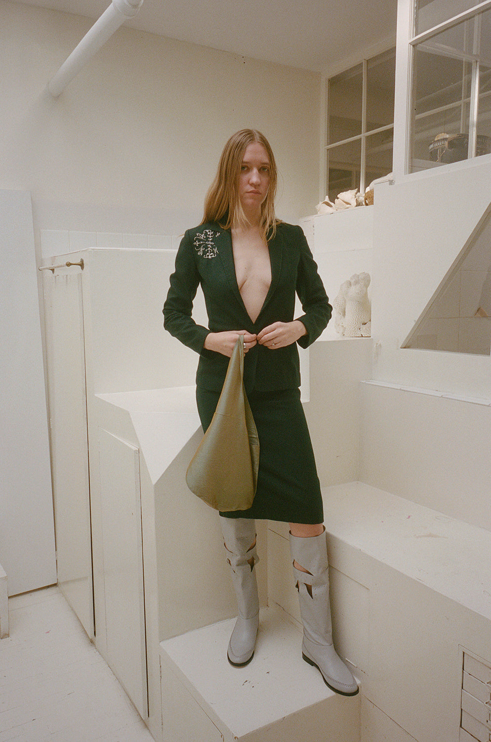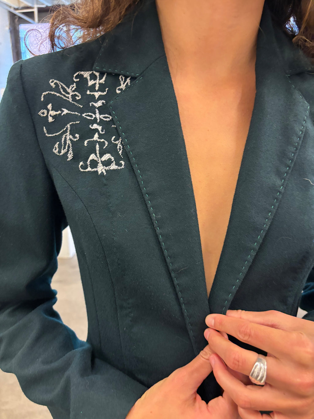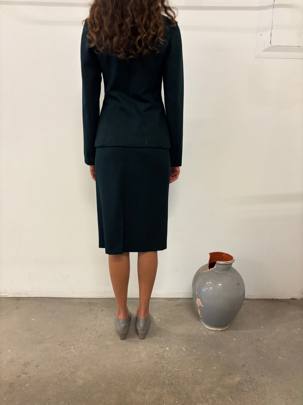 Dark green skirt suit with embroidery detail on wearer's right chest.