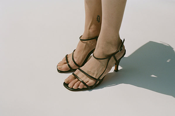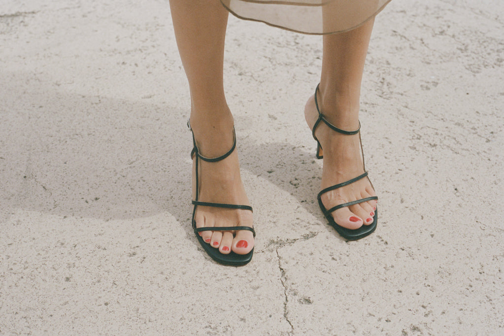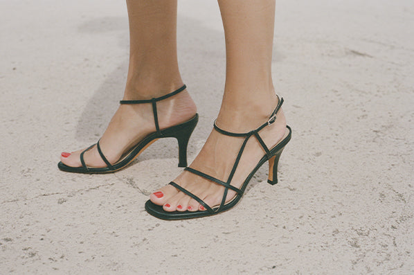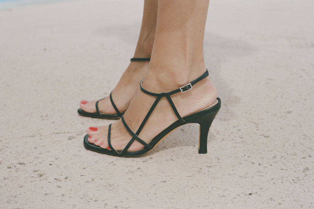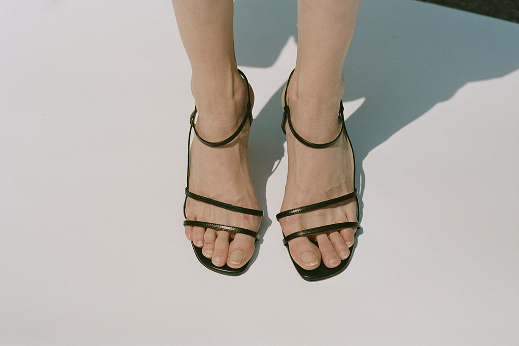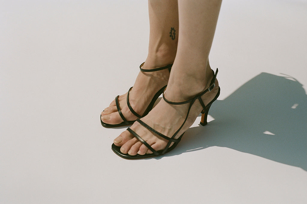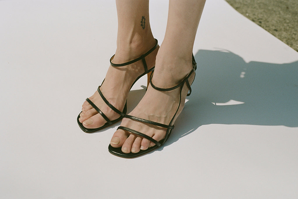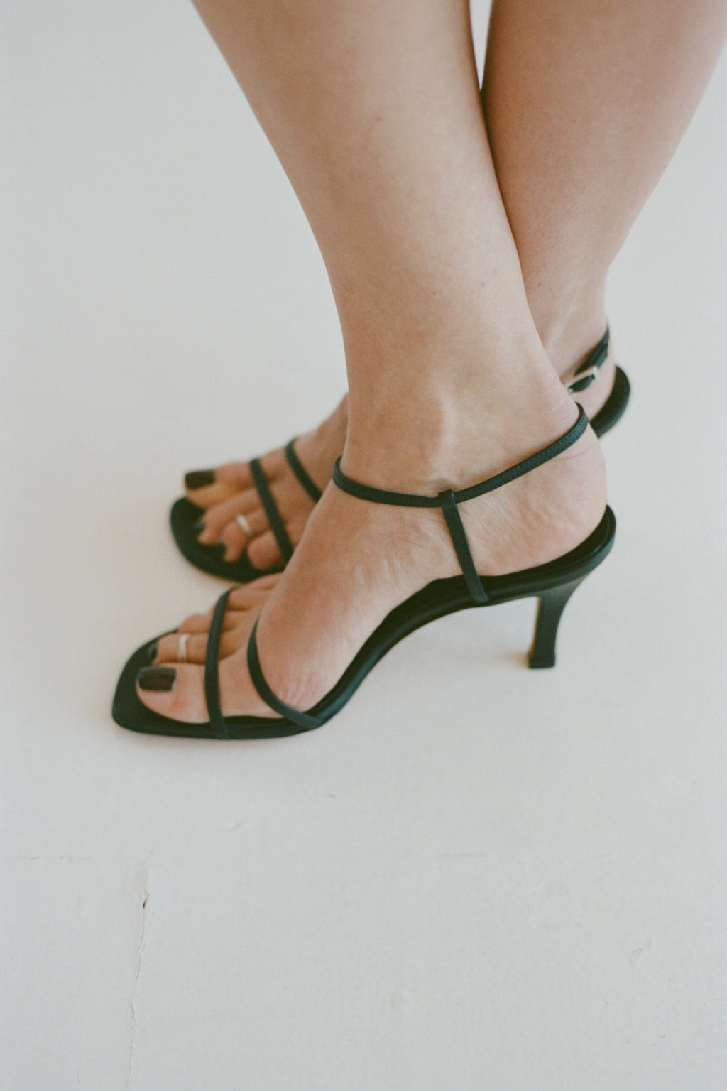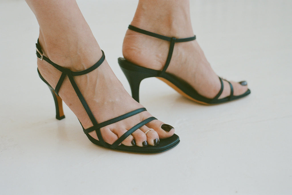 A stiletto sandal with thin straps across the toes. Adjustable buckle ankle strap in silver-toned hardware. 8cm heel height. Fits true to size.