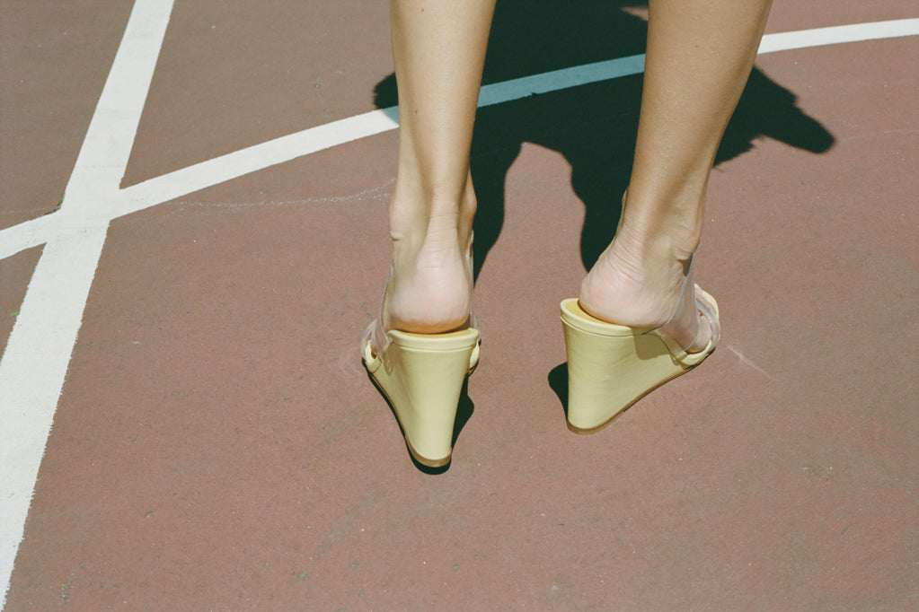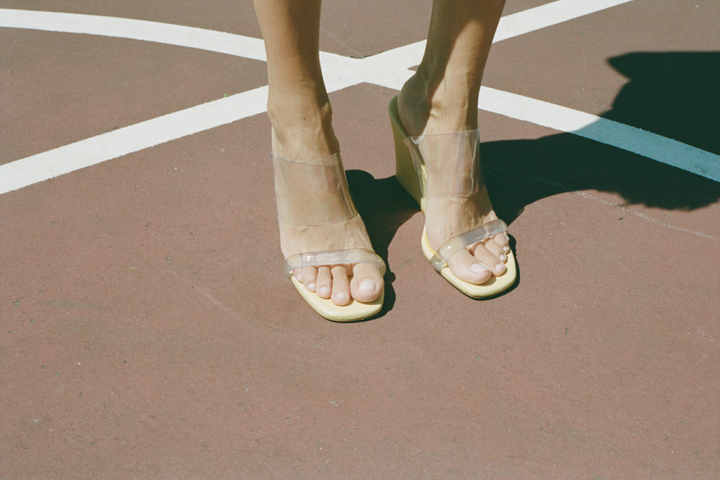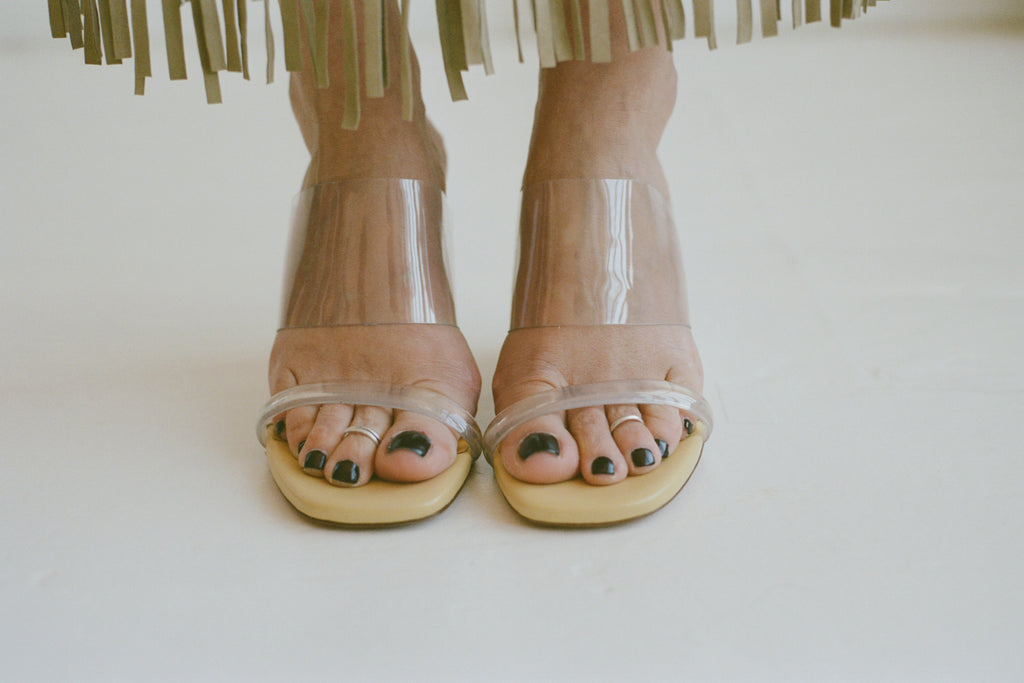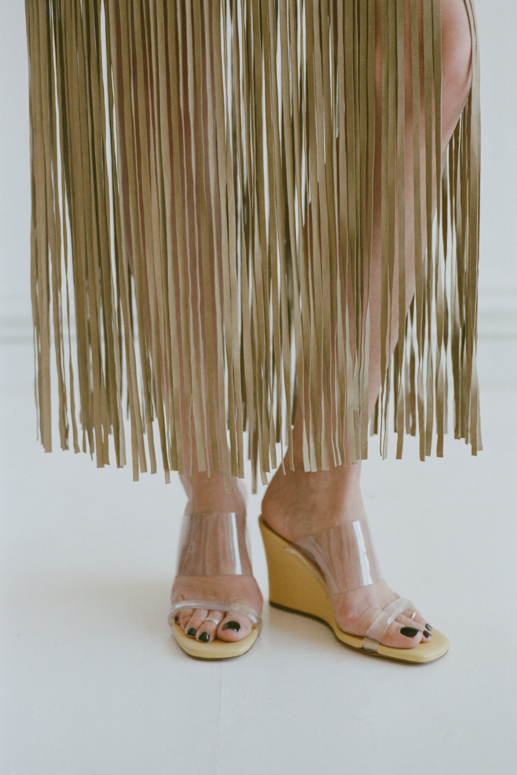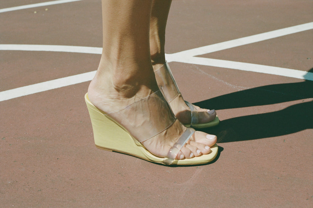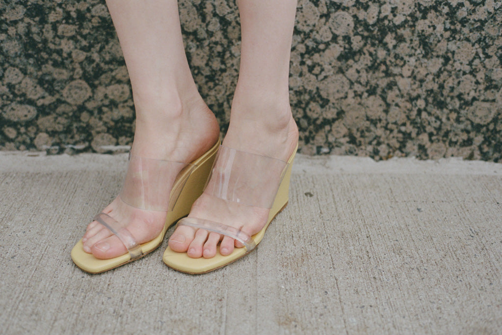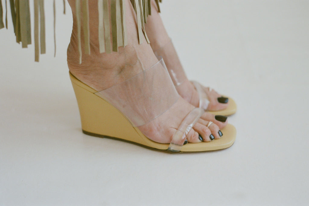 High wedges with two clear perspex bands. 8cm heel. Fits true to size.