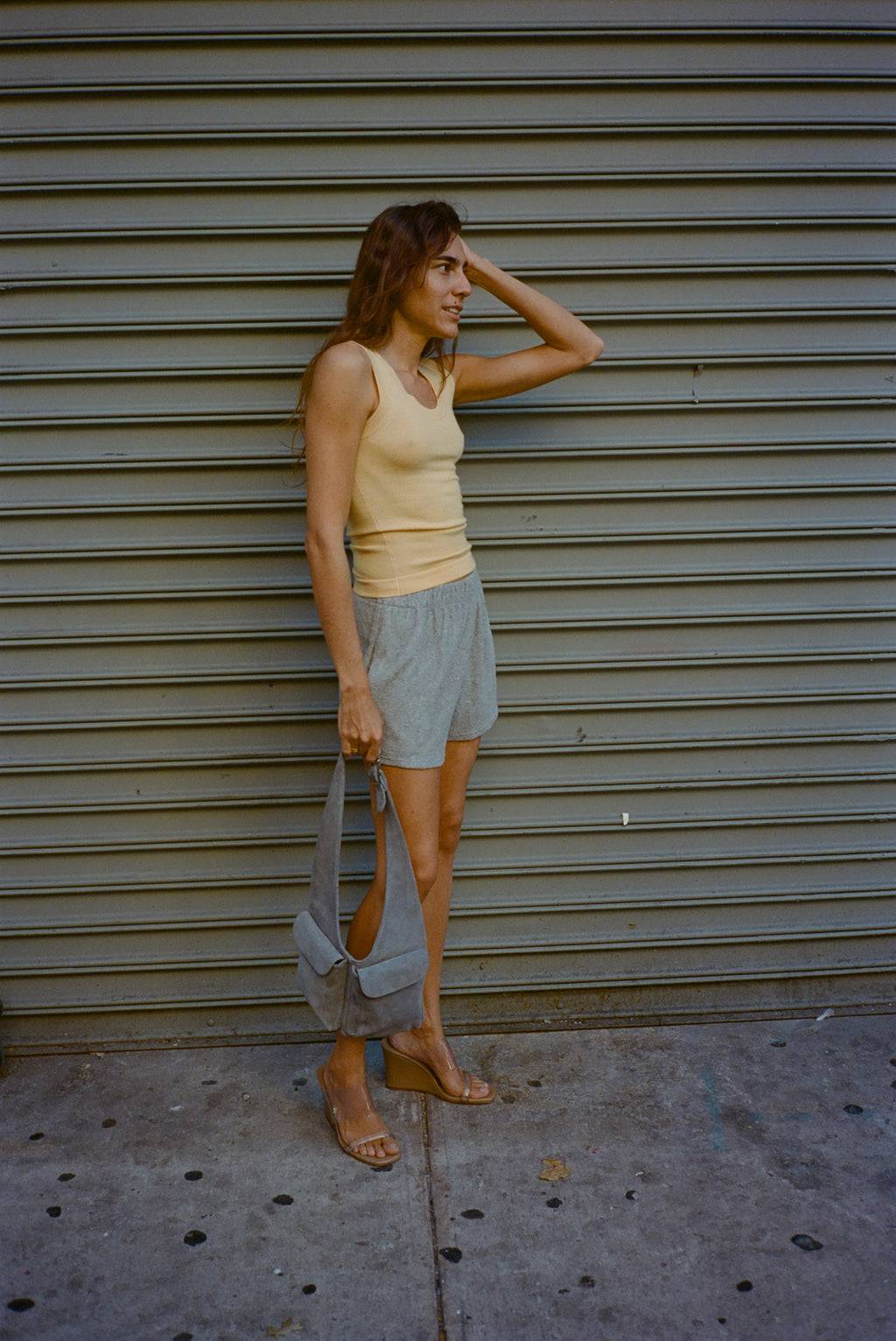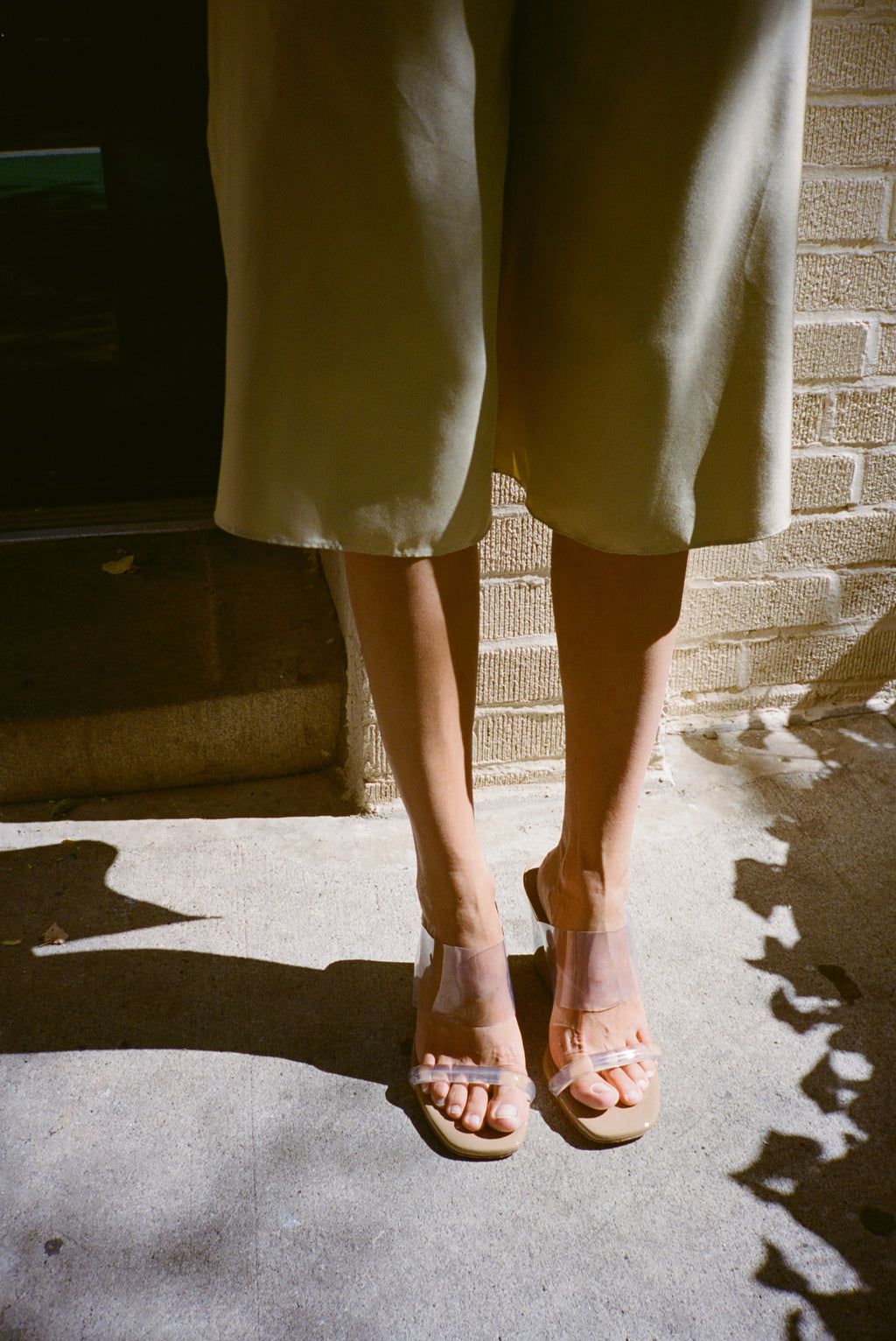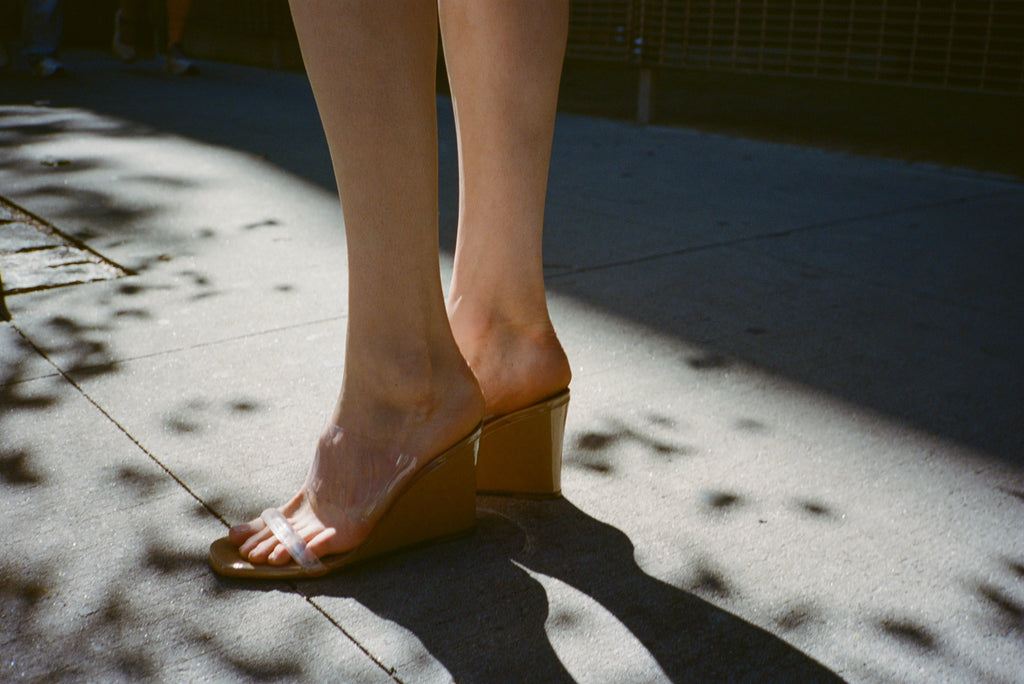 High wedges with two clear perspex bands. 8cm heel. Fits true to size.
