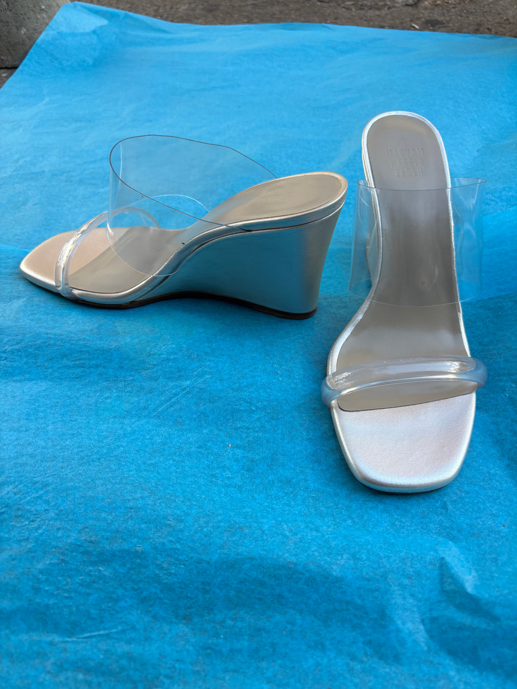 High wedges with two clear perspex bands. 8cm heel. Fits true to size.