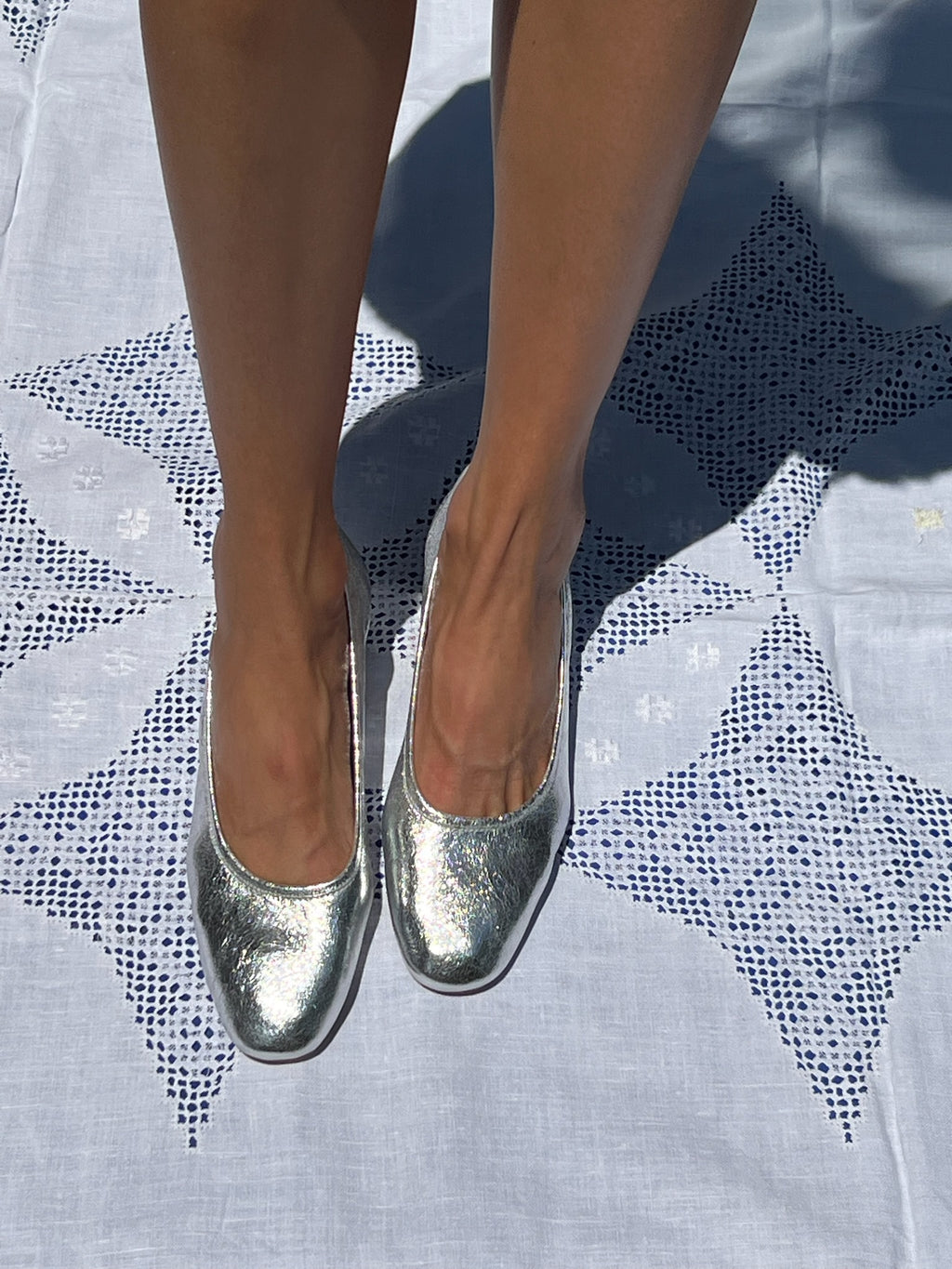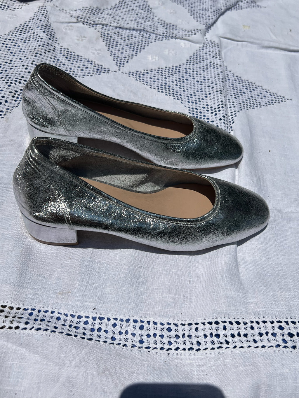 Slip on shoe with almond toe and soft upper. Please note that the metallic leather is slightly more cracked. 4cm stacked heel. Fits true to size.