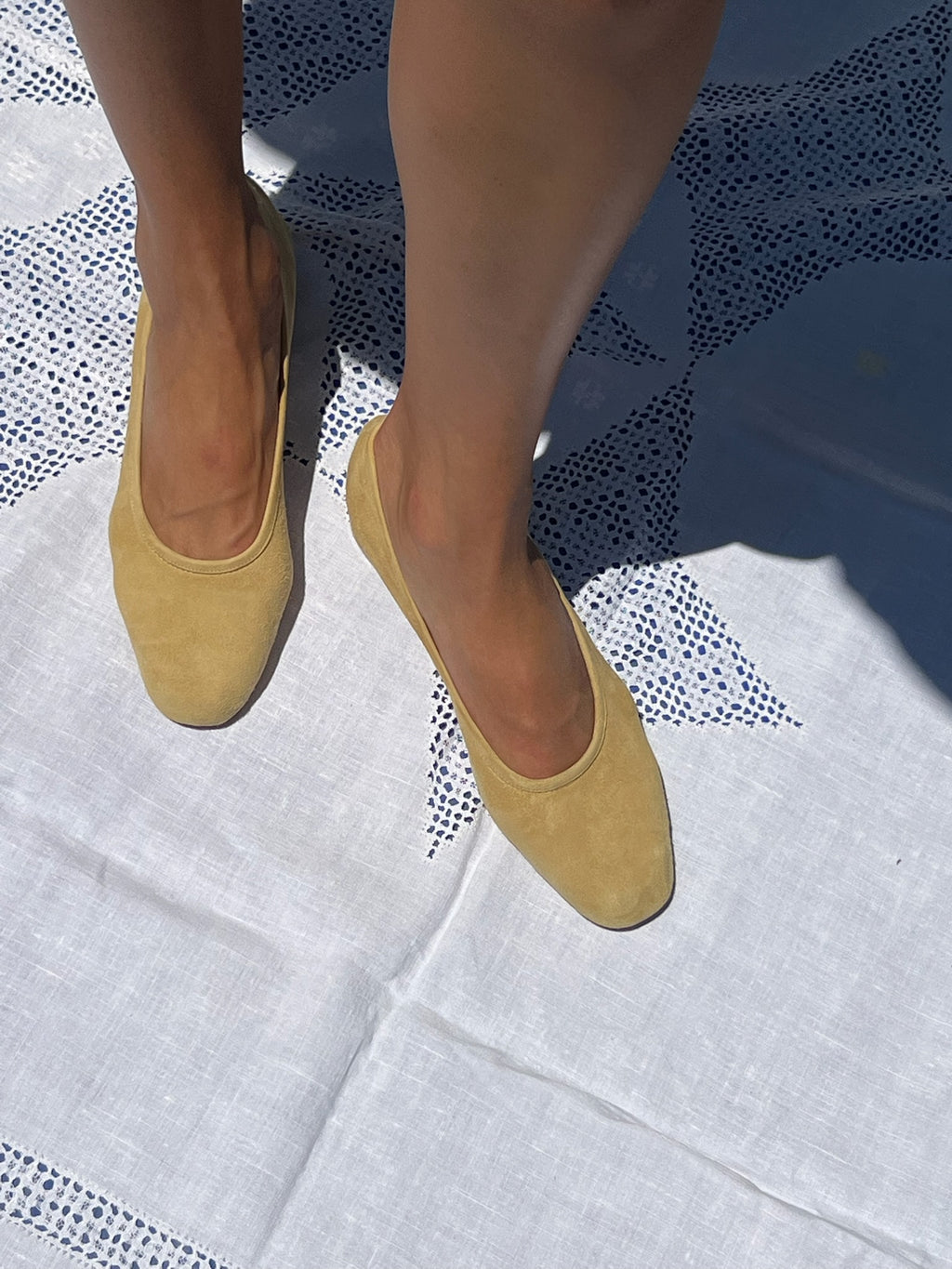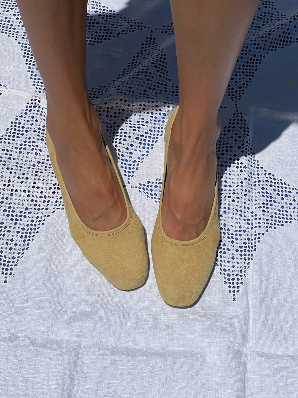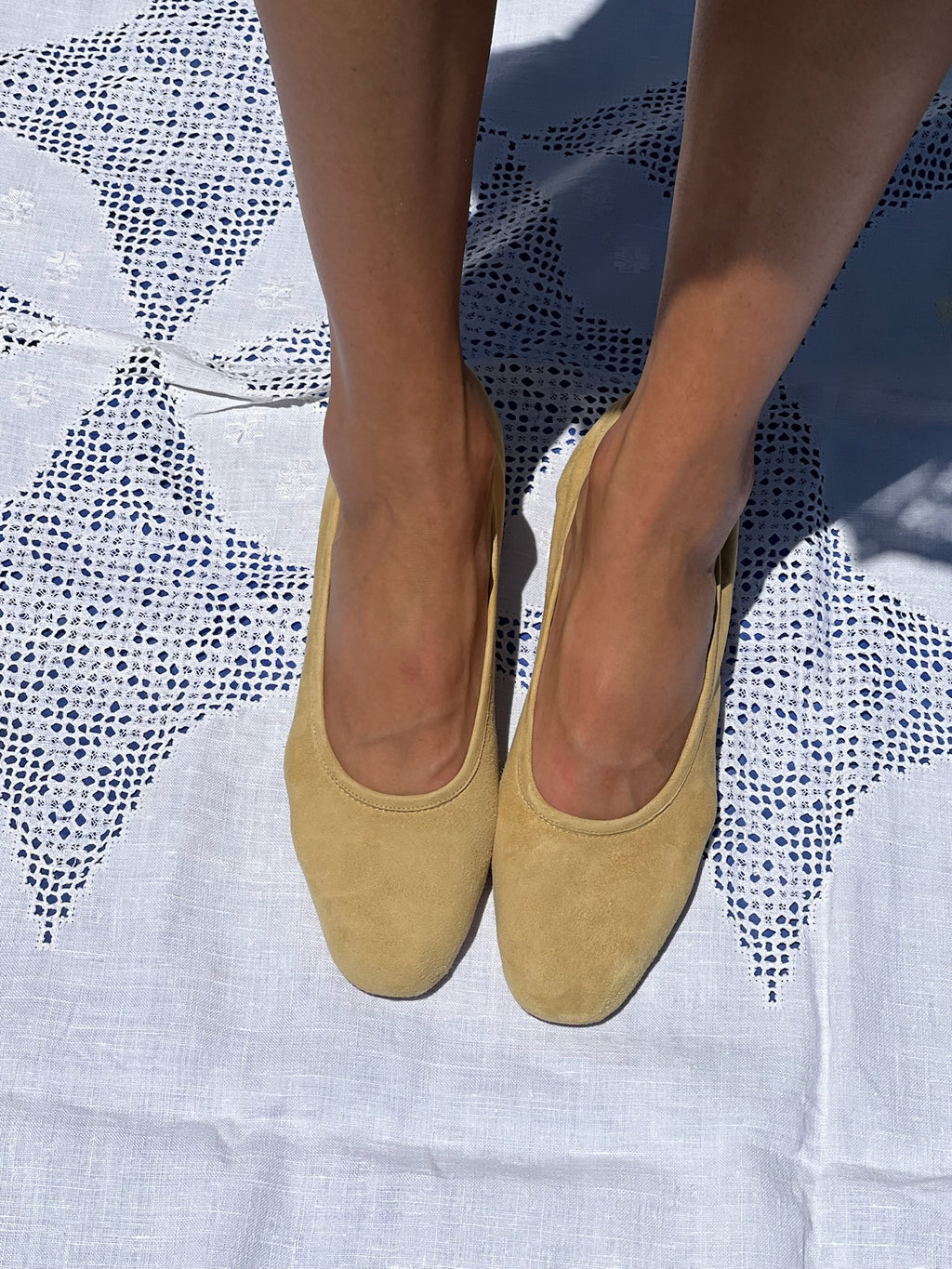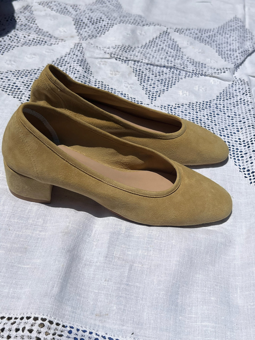 Slip on shoe in suede leather with almond toe and soft upper. 4cm stacked heel. Fits true to size.