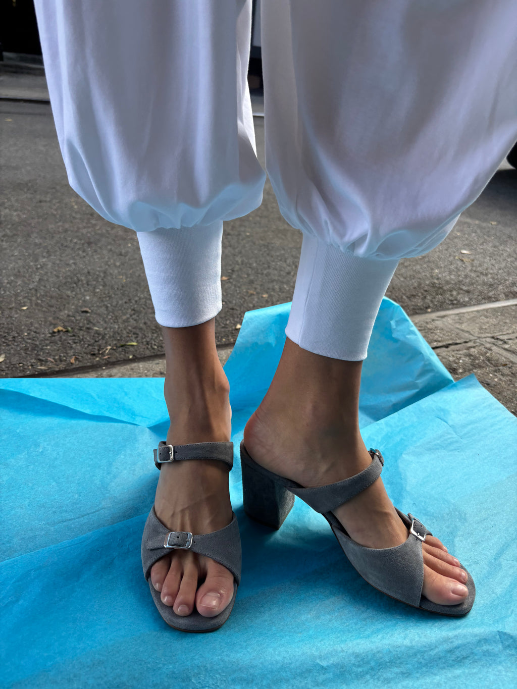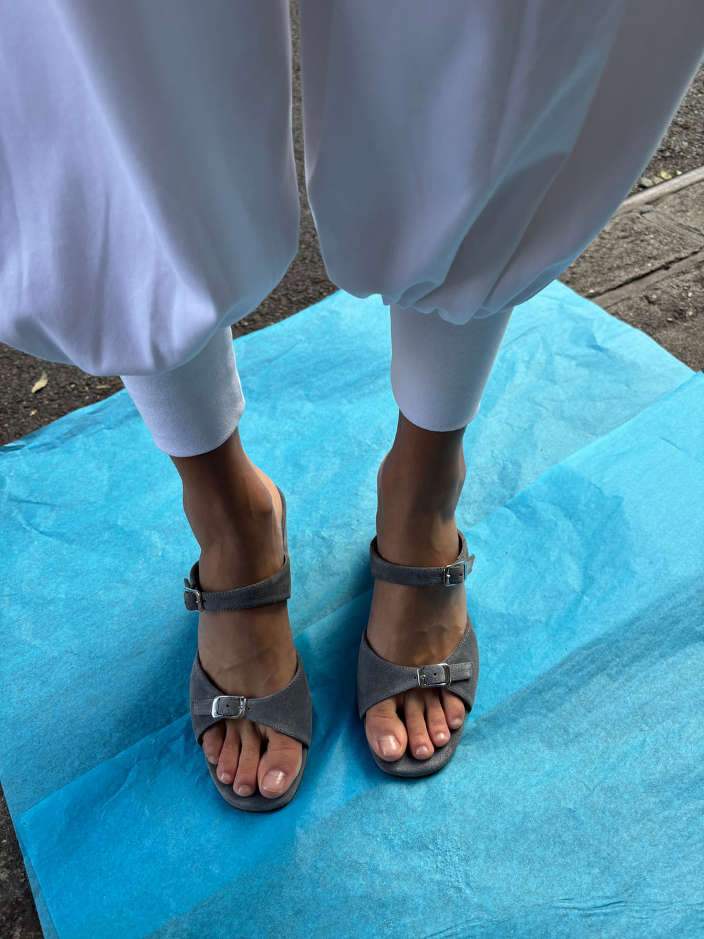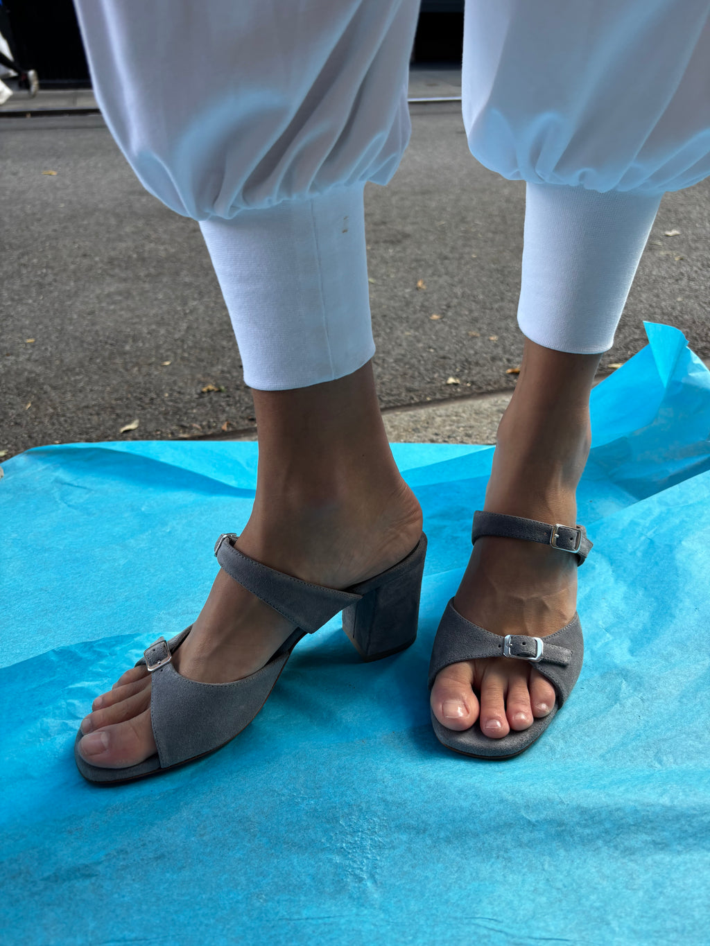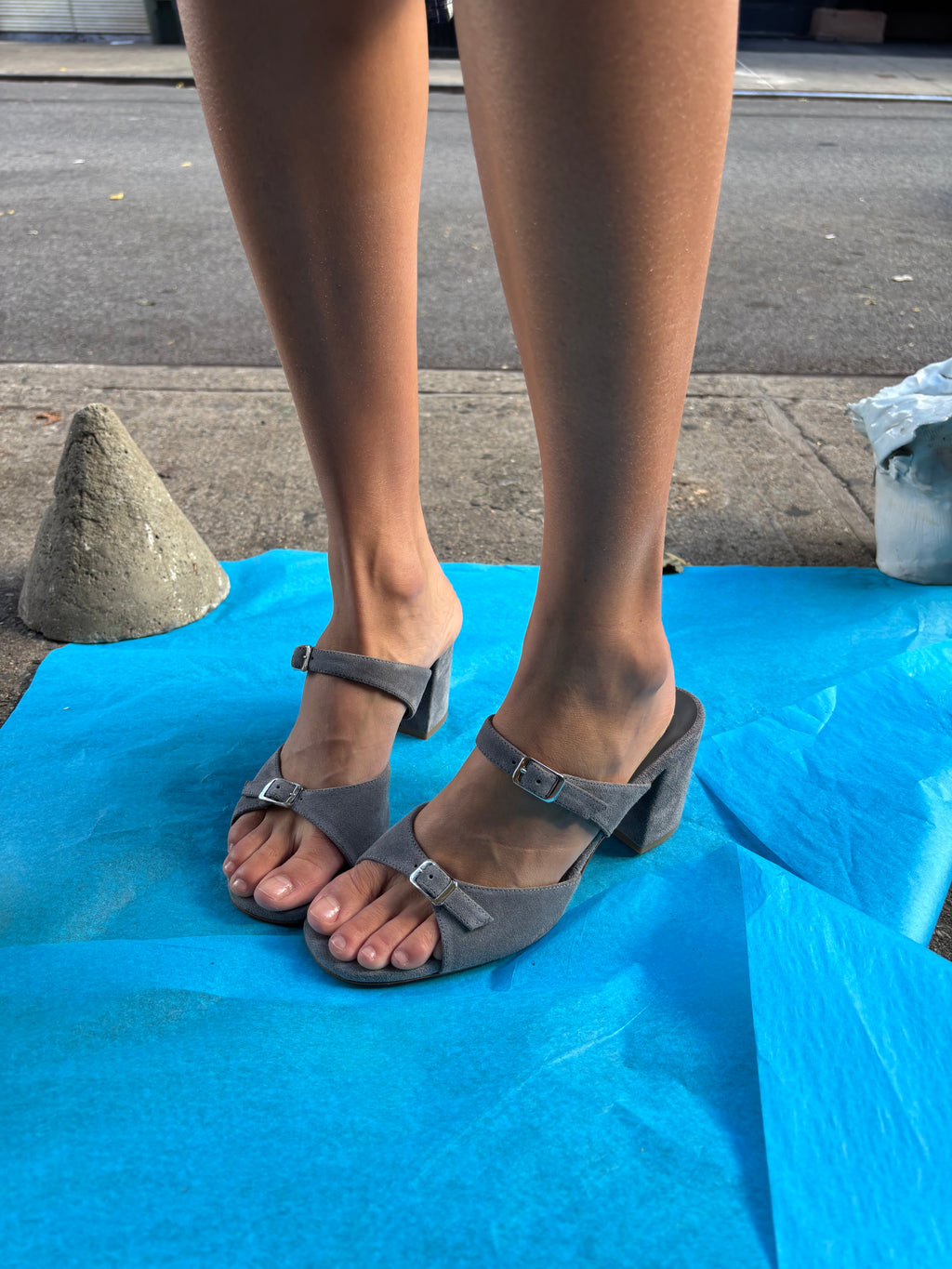 Sandal with two straps and buckle fastenings. Silver-toned hardware. 8cm block heel. Runs small. We suggest sizing a half size up.