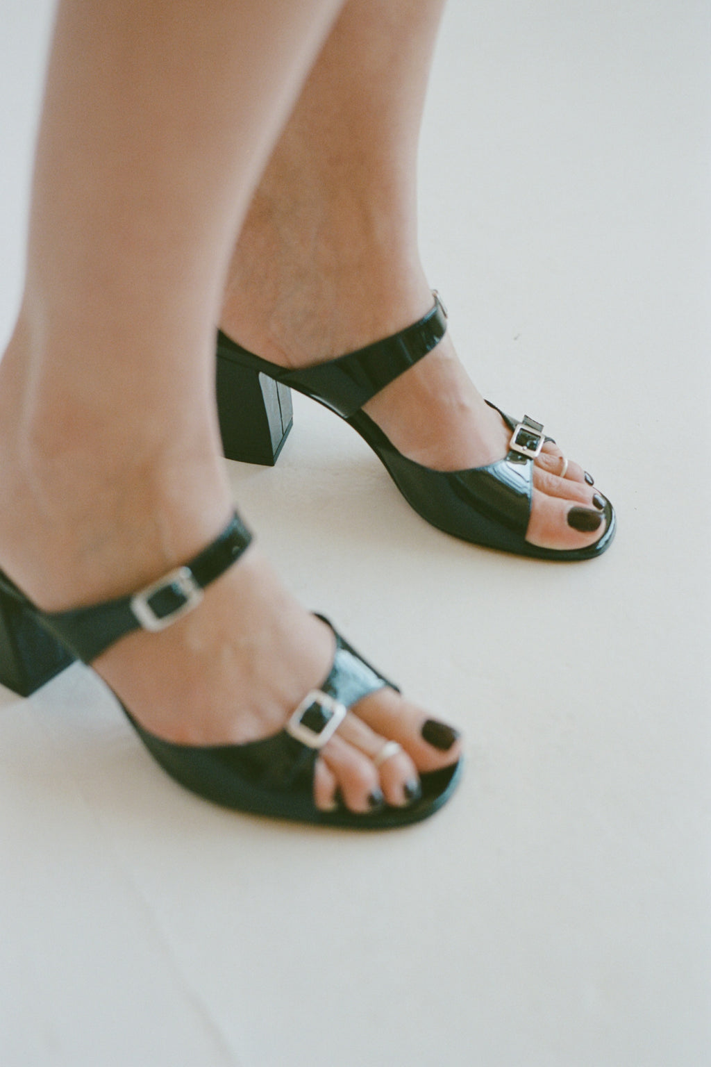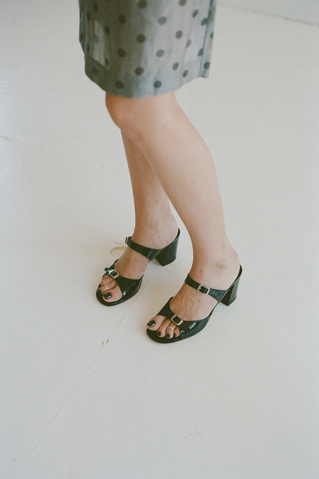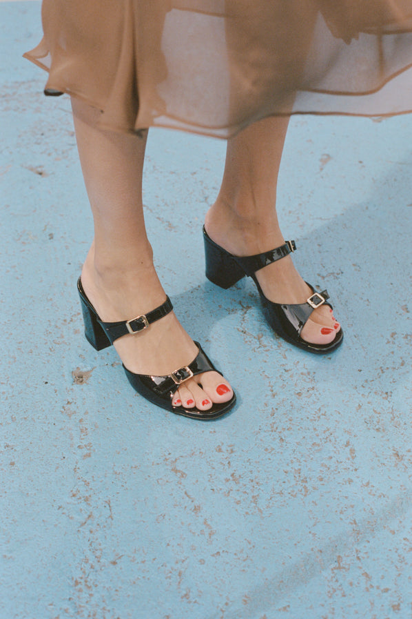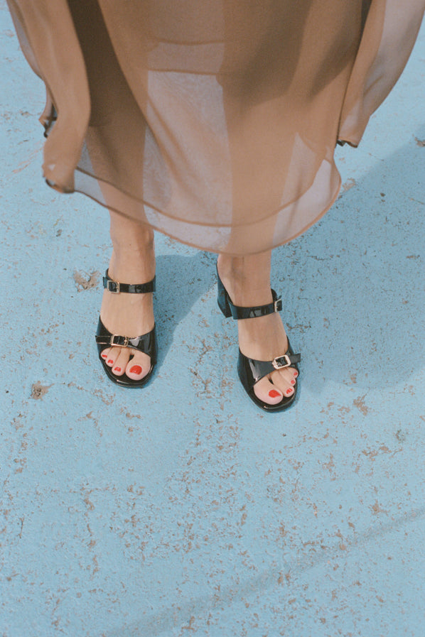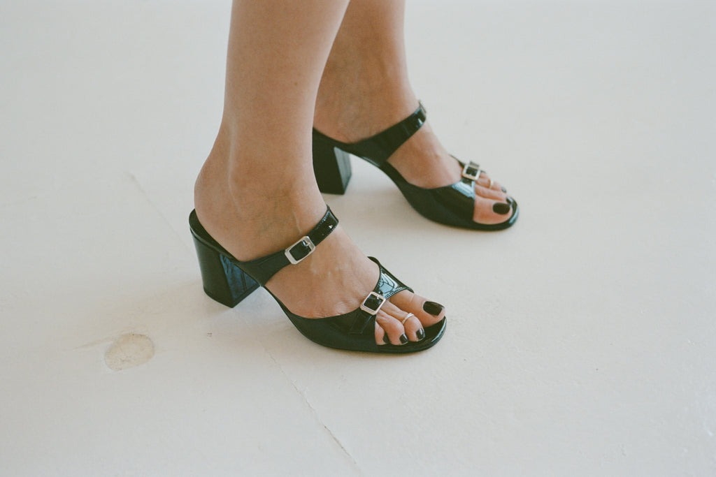 A vintage-style high heel with two straps and buckle fastenings. Gold-toned hardware. 8cm block heel. Runs small. We suggest sizing a half size up.