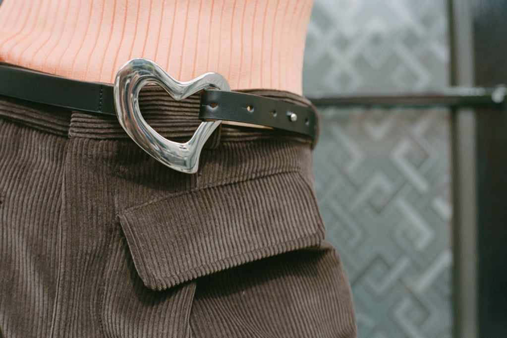A slim leather belt with a polished heart-shaped buckle. Adjustable peg and loop fastening.