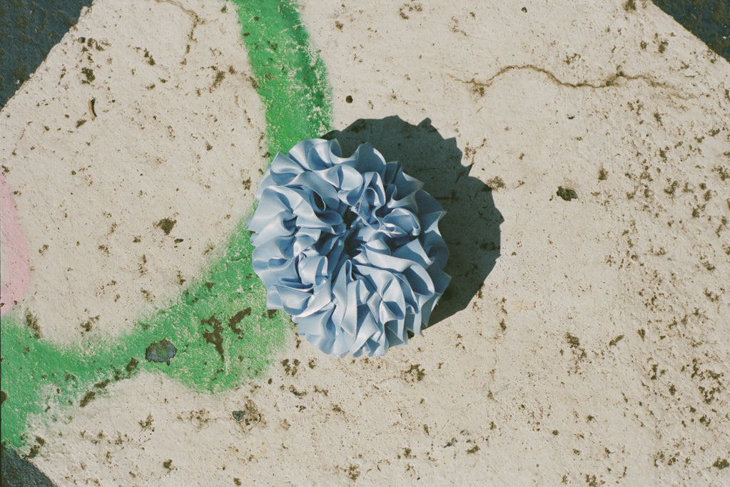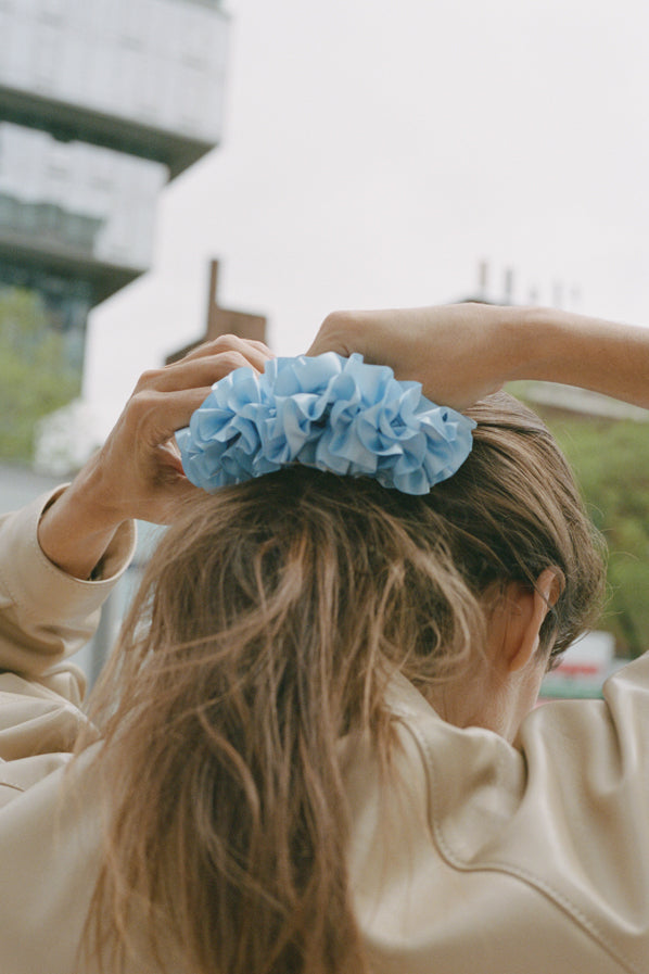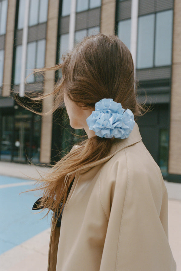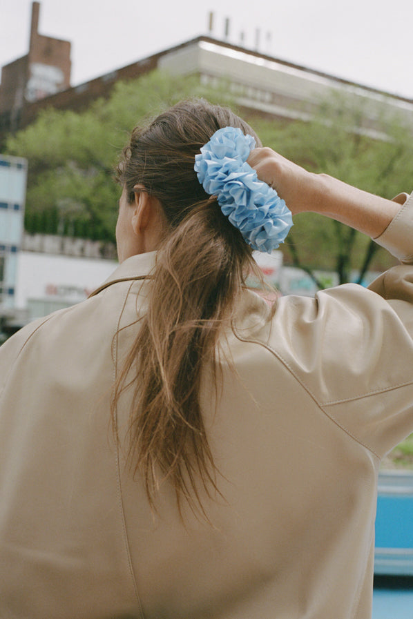 A furled silk scrunchie resembling carnation petals. To be worn in the hair or adorned on the wrist.