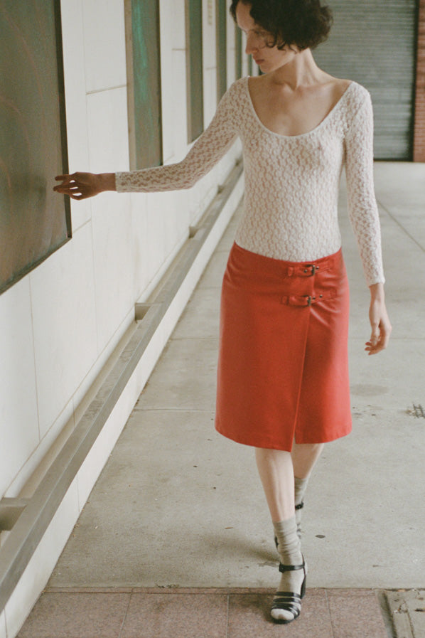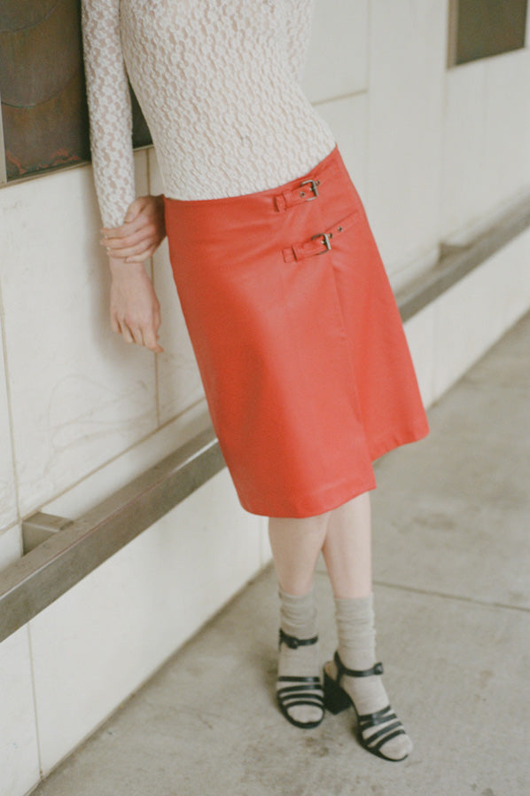 Low waist wrap skirt with two buckle closure at the hip.