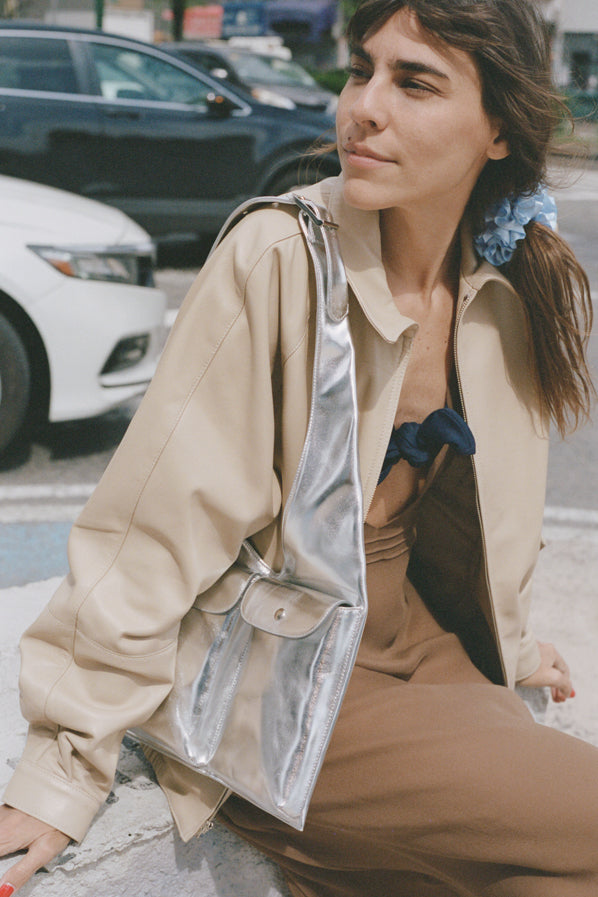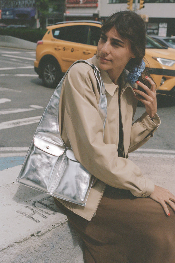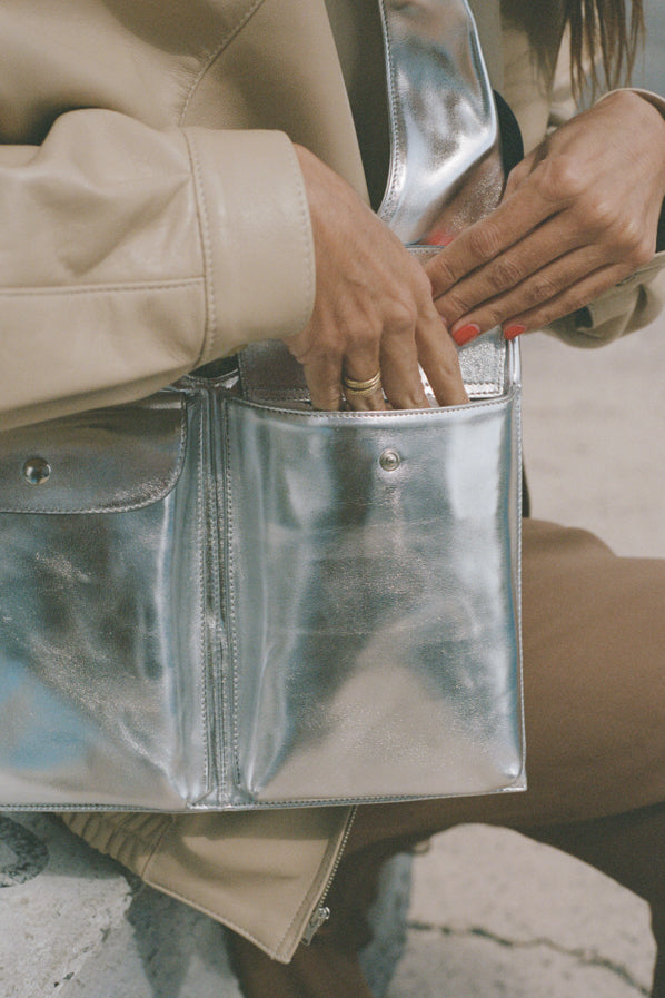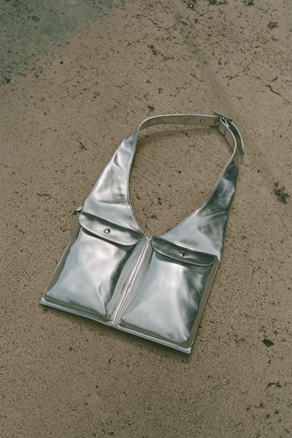 A flat shoulder bag featuring two flap patch pockets with snap fastenings. Zipper compartments at opposite side. Adjustable buckled shoulder strap. Silver-toned hardware.